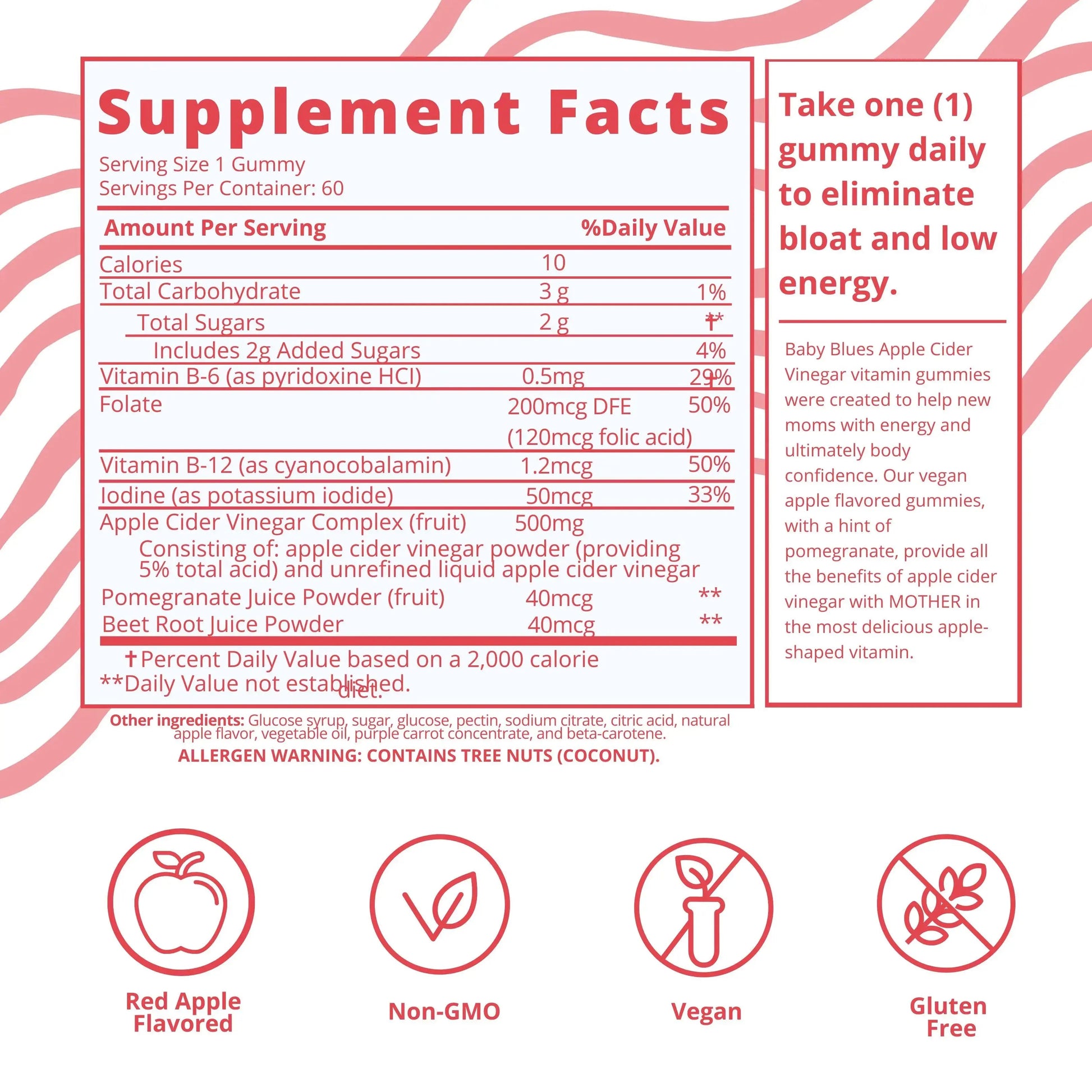 Boost your energy and digestive health with our Baby Blues Apple Cider Vinegar Gummies for Moms, designed specifically for breastfeeding mothers. These delicious apple-flavored ACV gummies, infused with the Mother, Vitamin B12, and folic acid, provide a convenient and effective way to support your postpartum wellness and overall health.