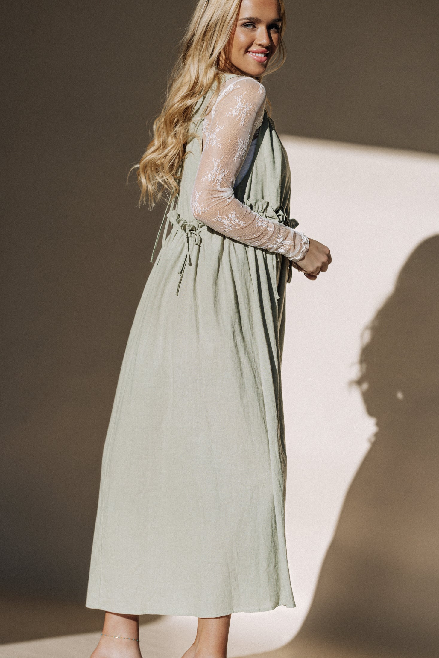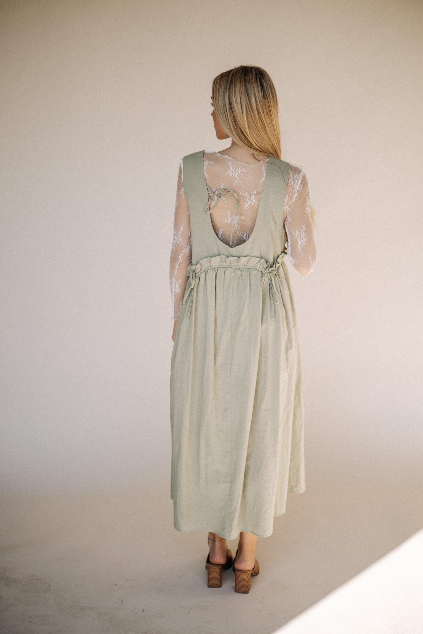 Introducing the Arey Overall Dress . This back tie overall dress boasts hip pockets and a subtle print, perfect for effortlessly layering. Elevate your wardrobe with this simple and exclusive piece, perfect for everyday wear.