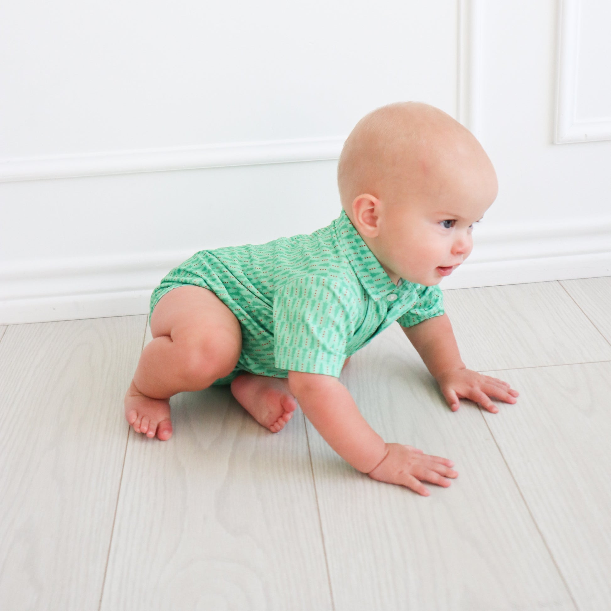 The classic green backdrop is sprinkled with tiny Christmas trees for a subtle festive touch that’s perfect for holiday gatherings, Christmas photos, and cozy family celebrations. The collared polo style keeps him looking sharp, while the easy snap closures make diaper changes quick and simple for mom.