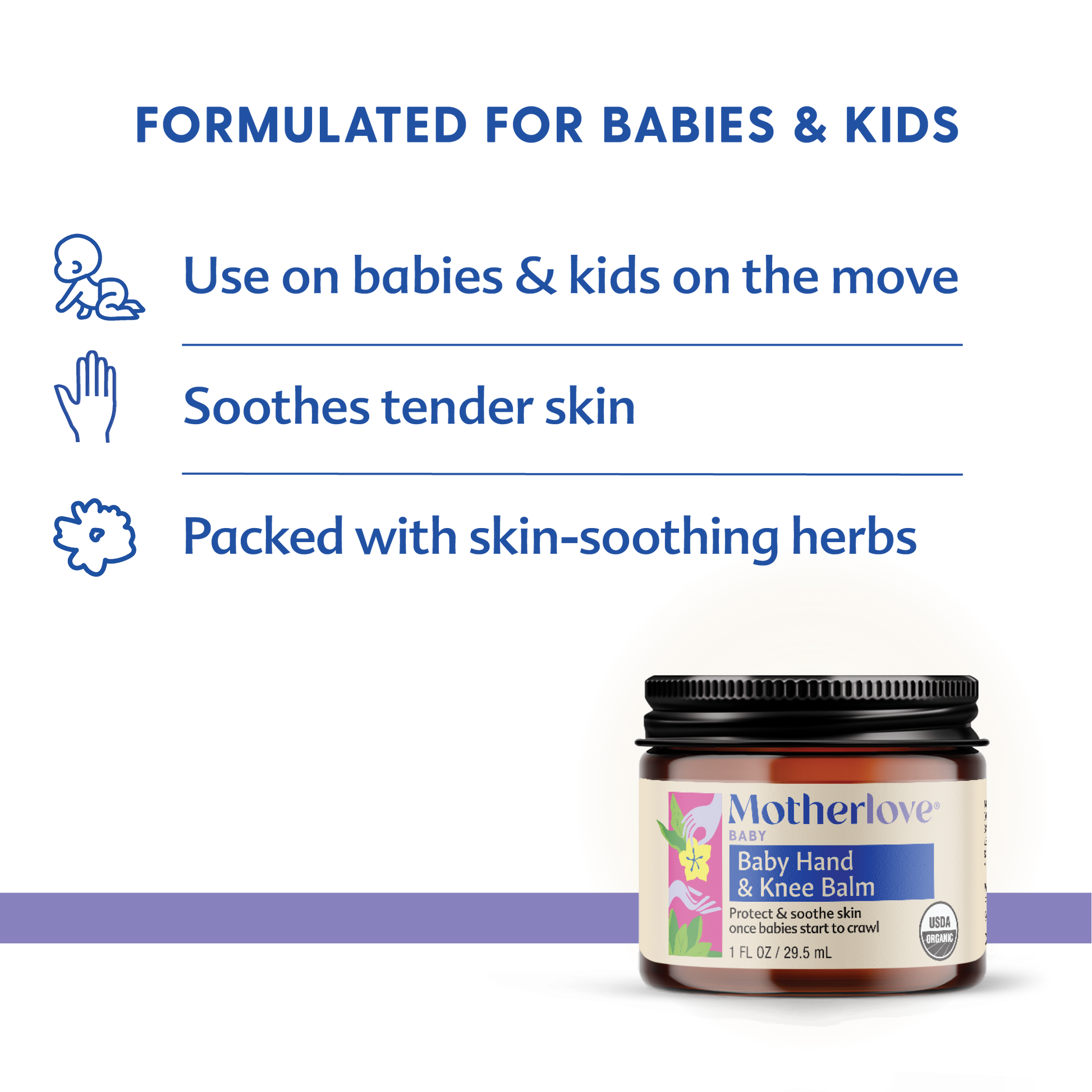 Baby Hand & Knee Balm is a specially created herbal balm for your little one once they start to crawl. The world is your baby's oyster now, which means coming in contact with environmental irritants.