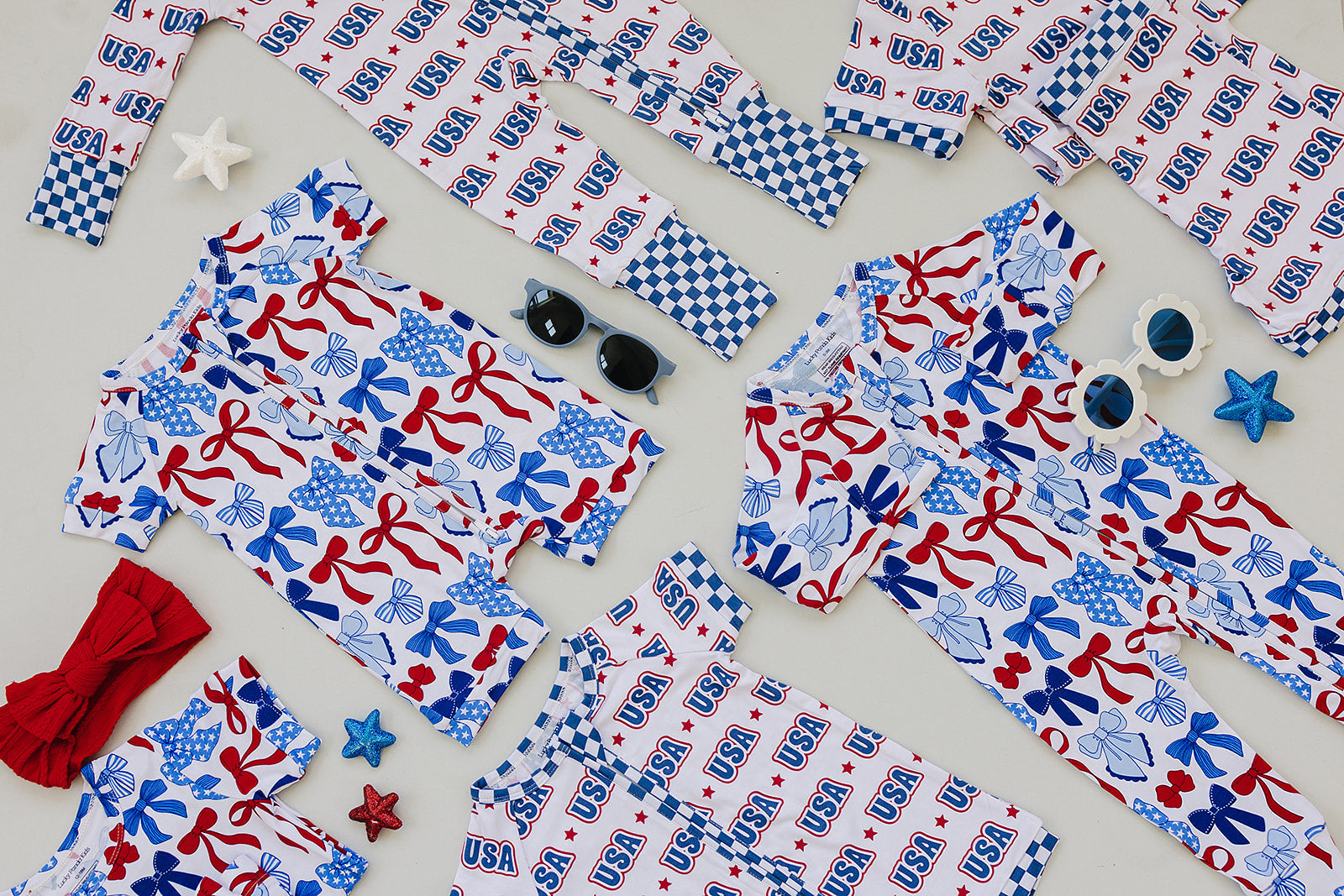 Sweet summer style with a patriotic twist — the Bamboo Shorty Romper | Red-White & Bows!