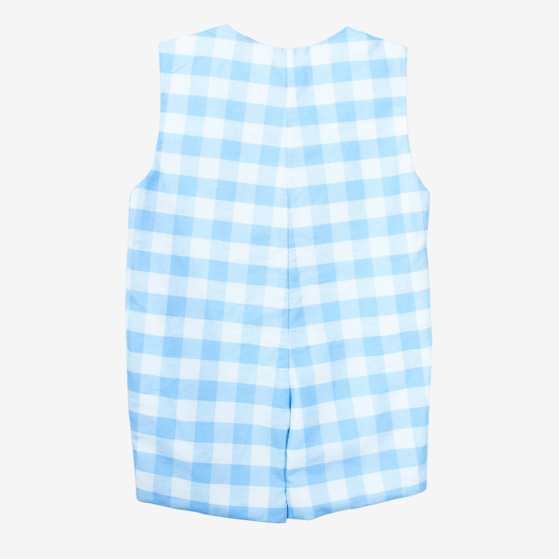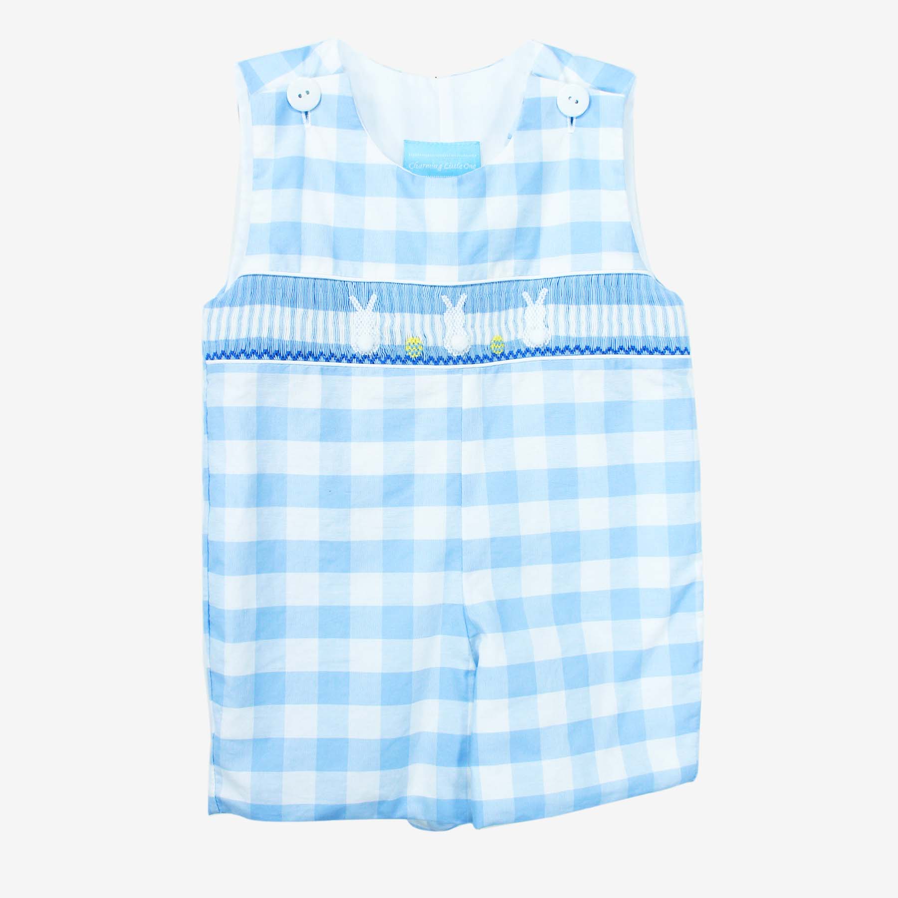 Light blue checkered shortall with bunny embroidery.