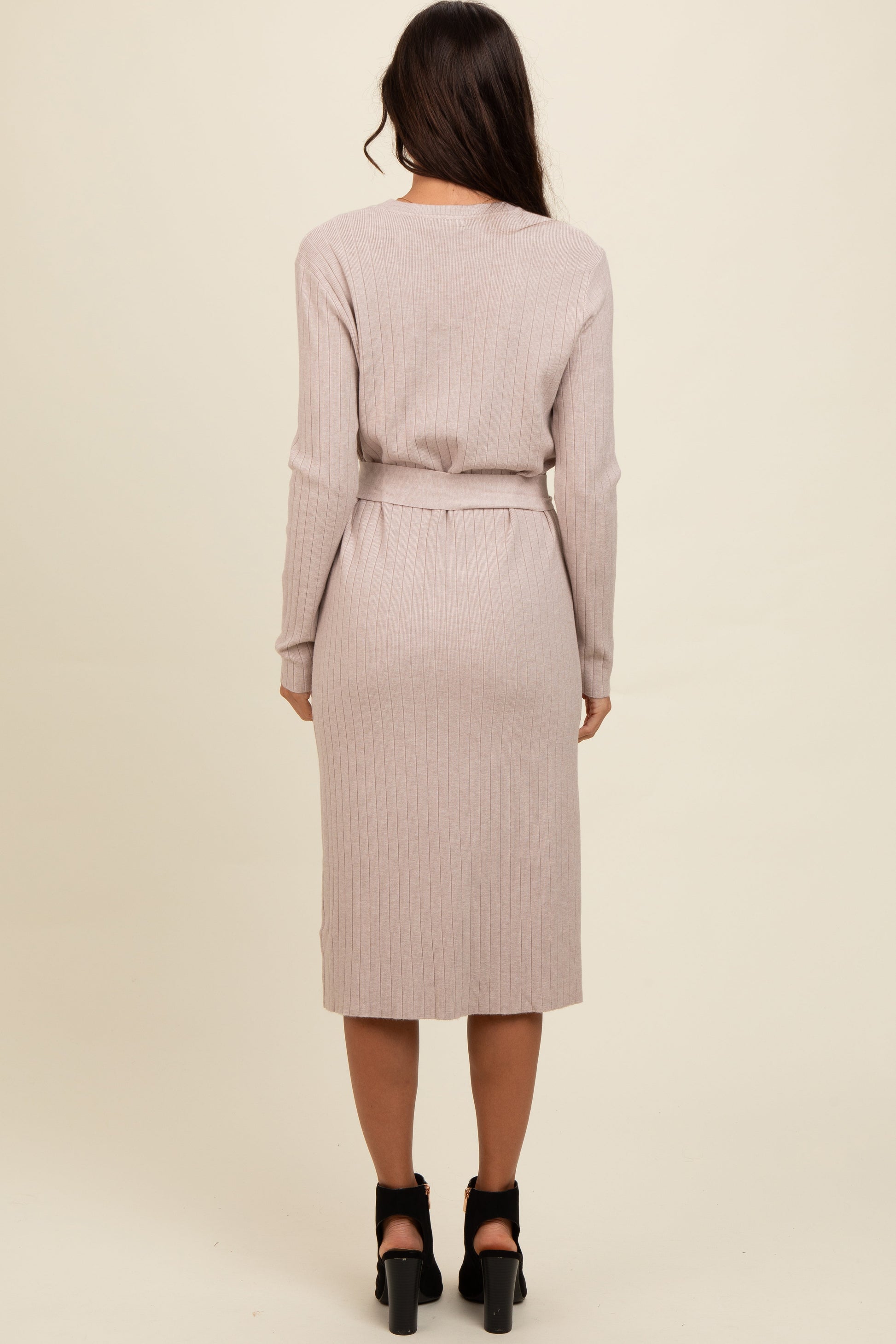 Beige Ribbed Sash Tie Midi Sweater Dress