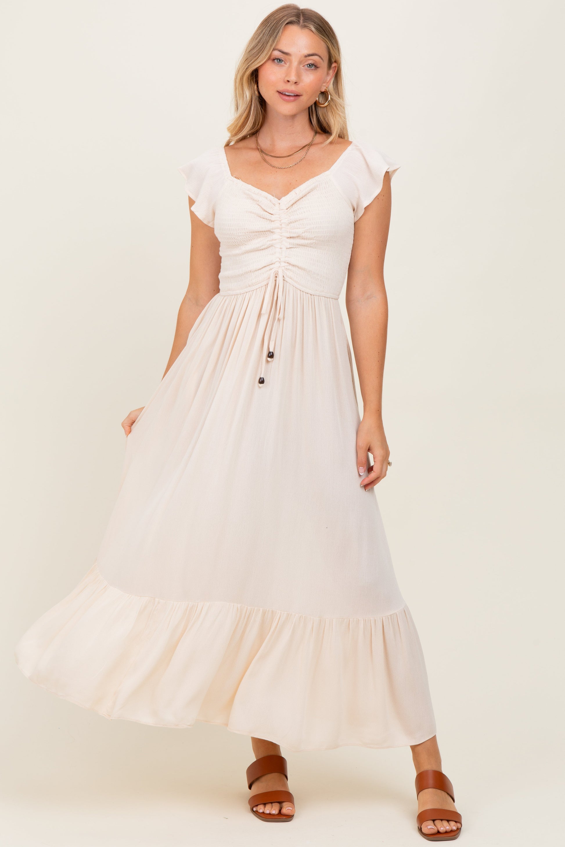 Beige Smocked Ruched Ruffle Hem Maxi Dress