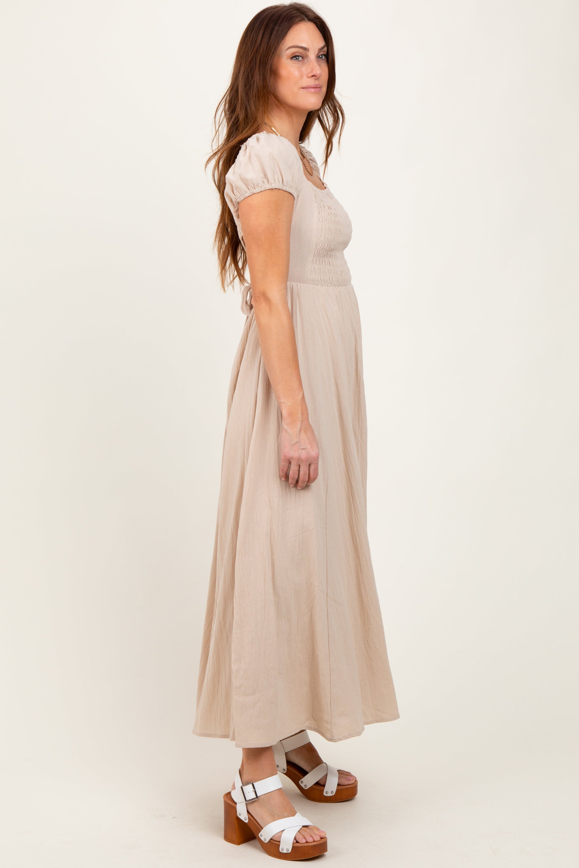 Beige Square Neck Smocked Top Criss Cross Back Tie Maxi Dress