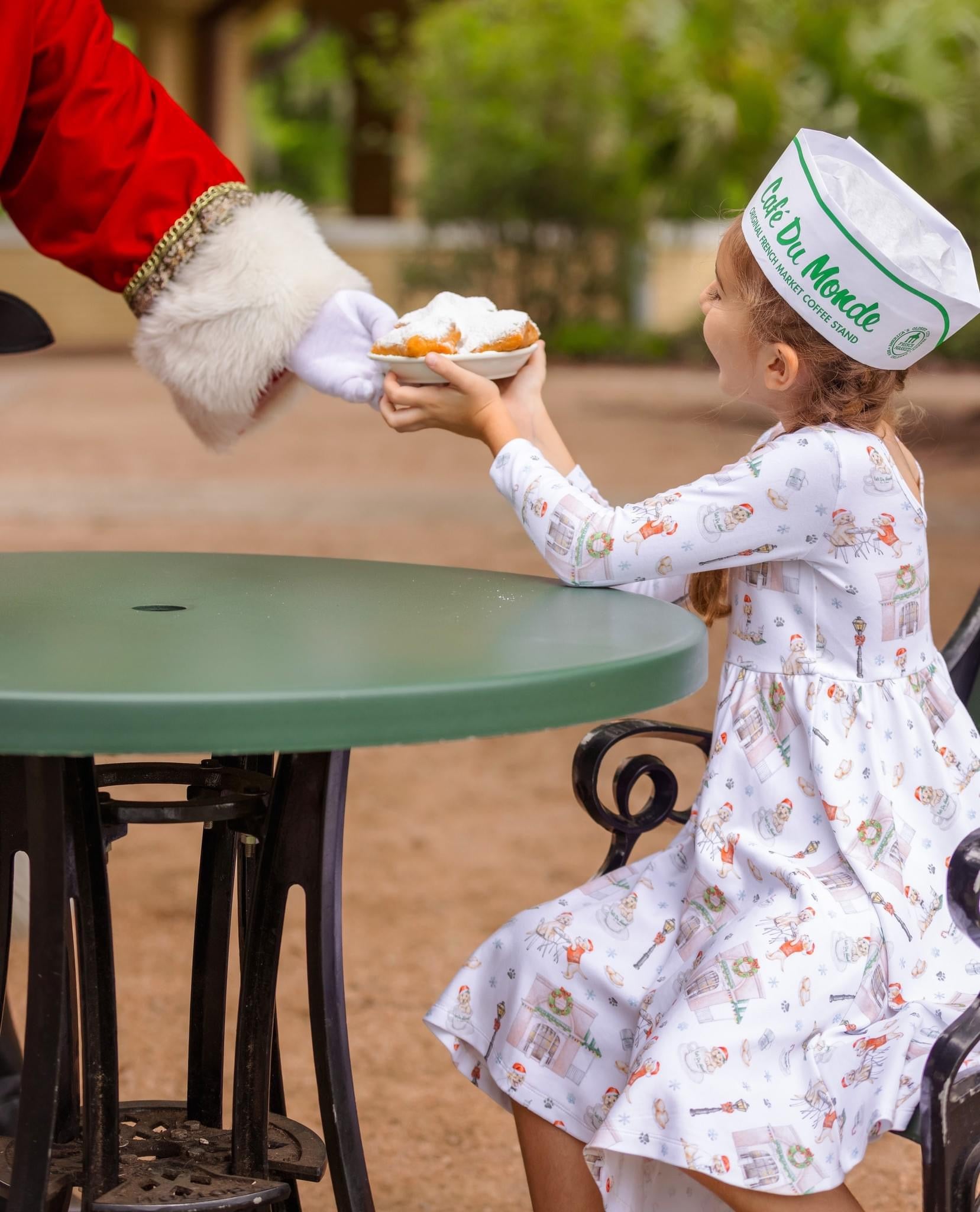 Our 'Beignet Holiday' organic cotton dress is the perfect holiday outfit for your little beignet-lover!