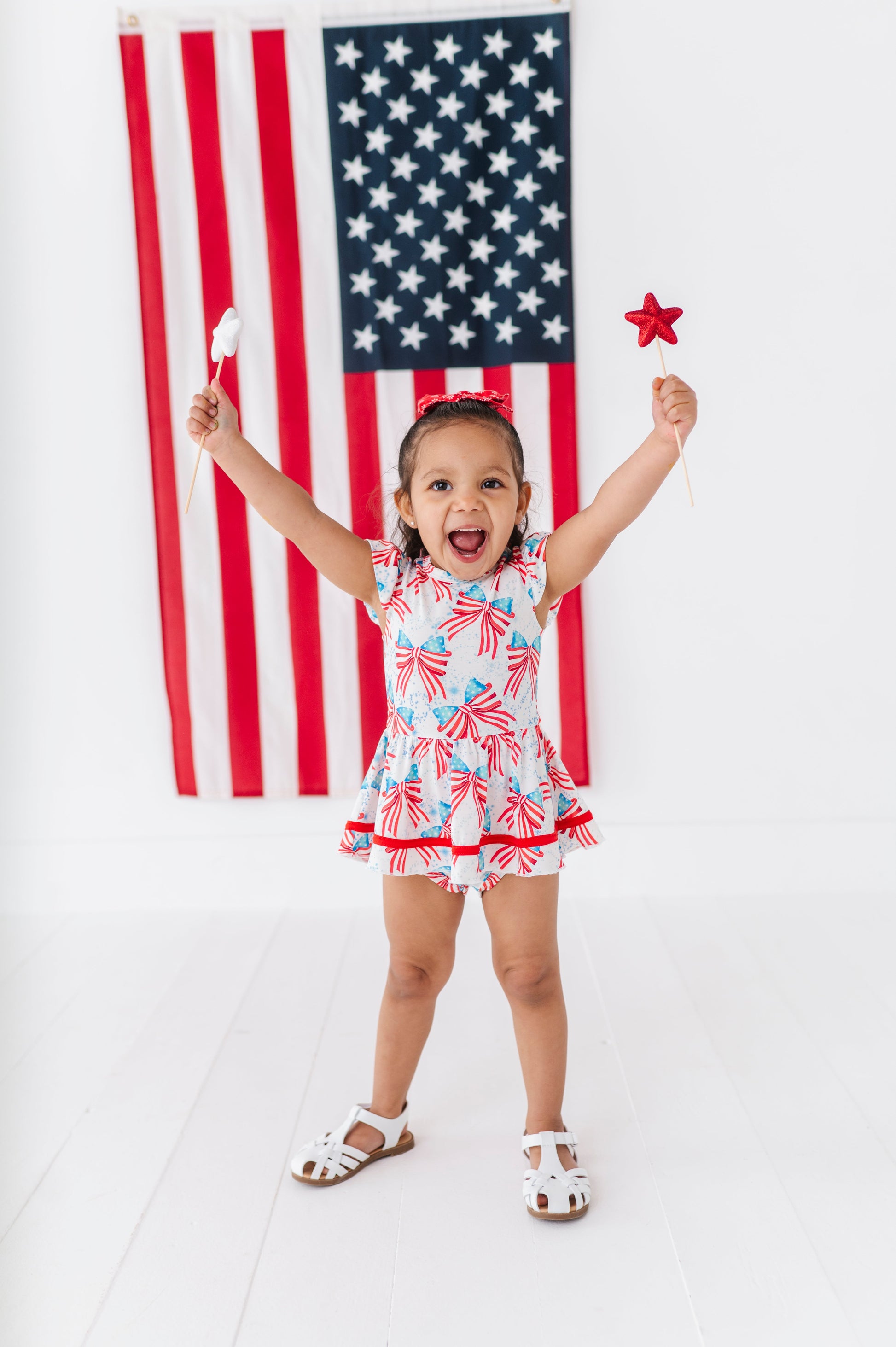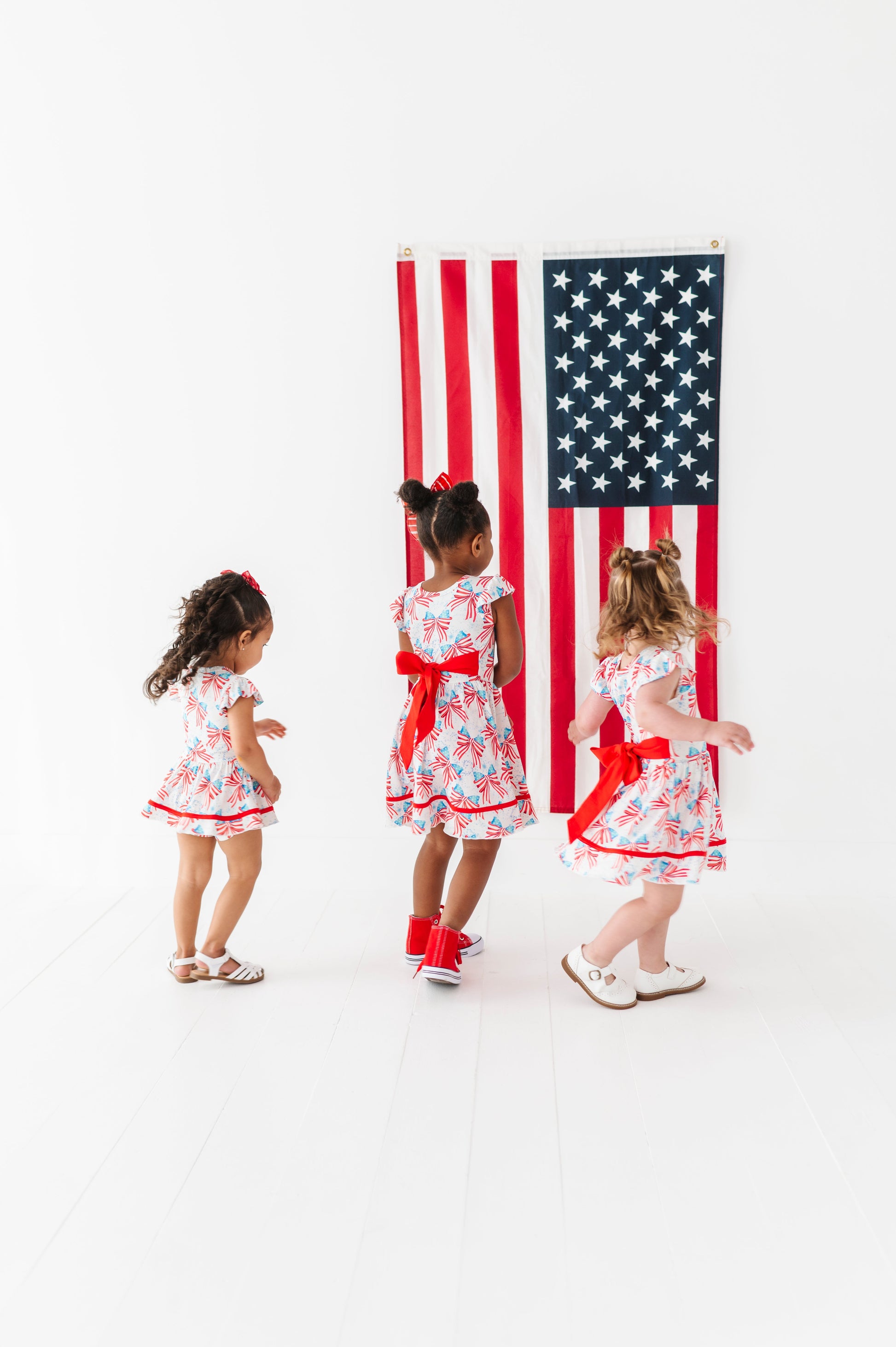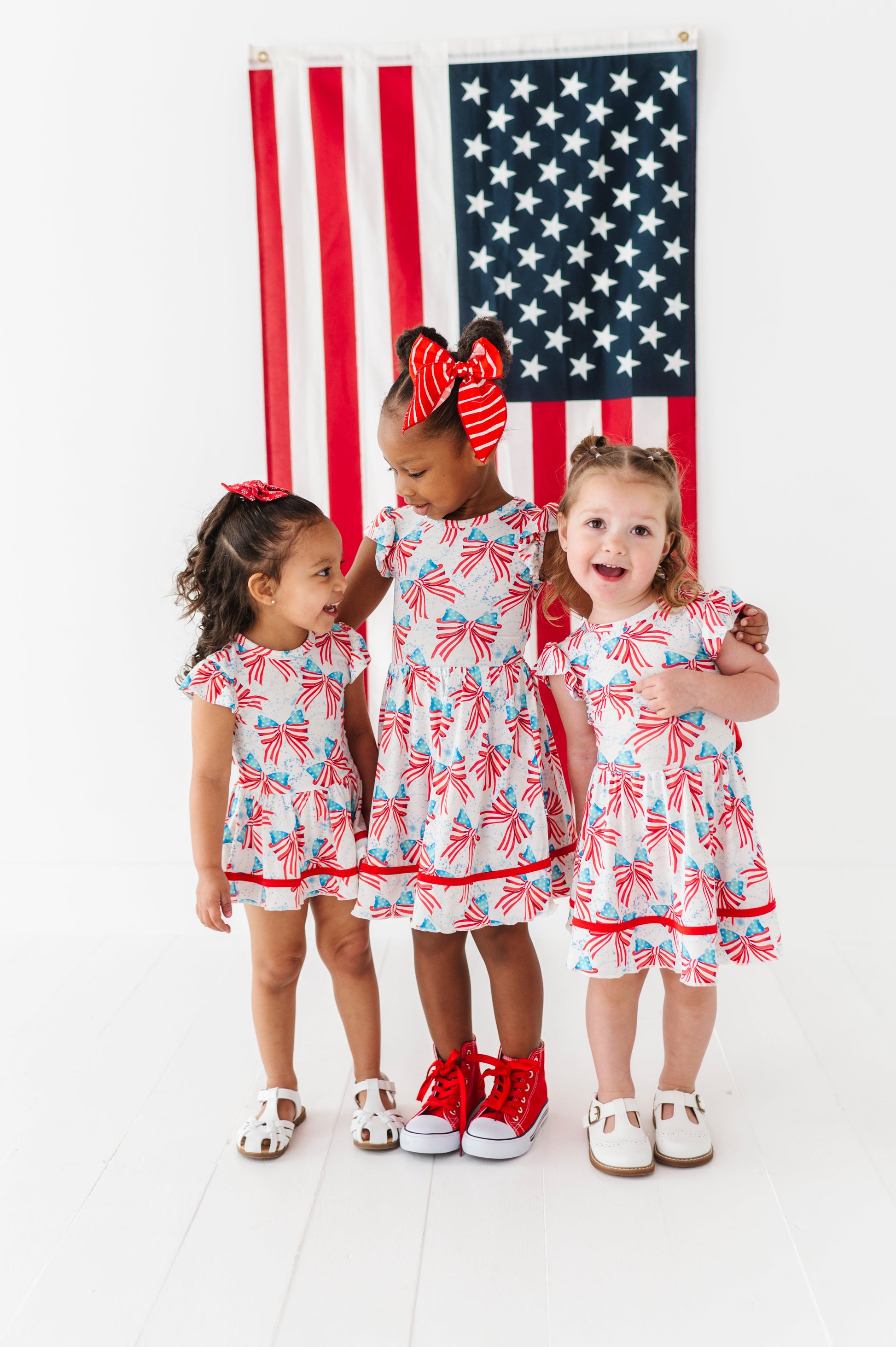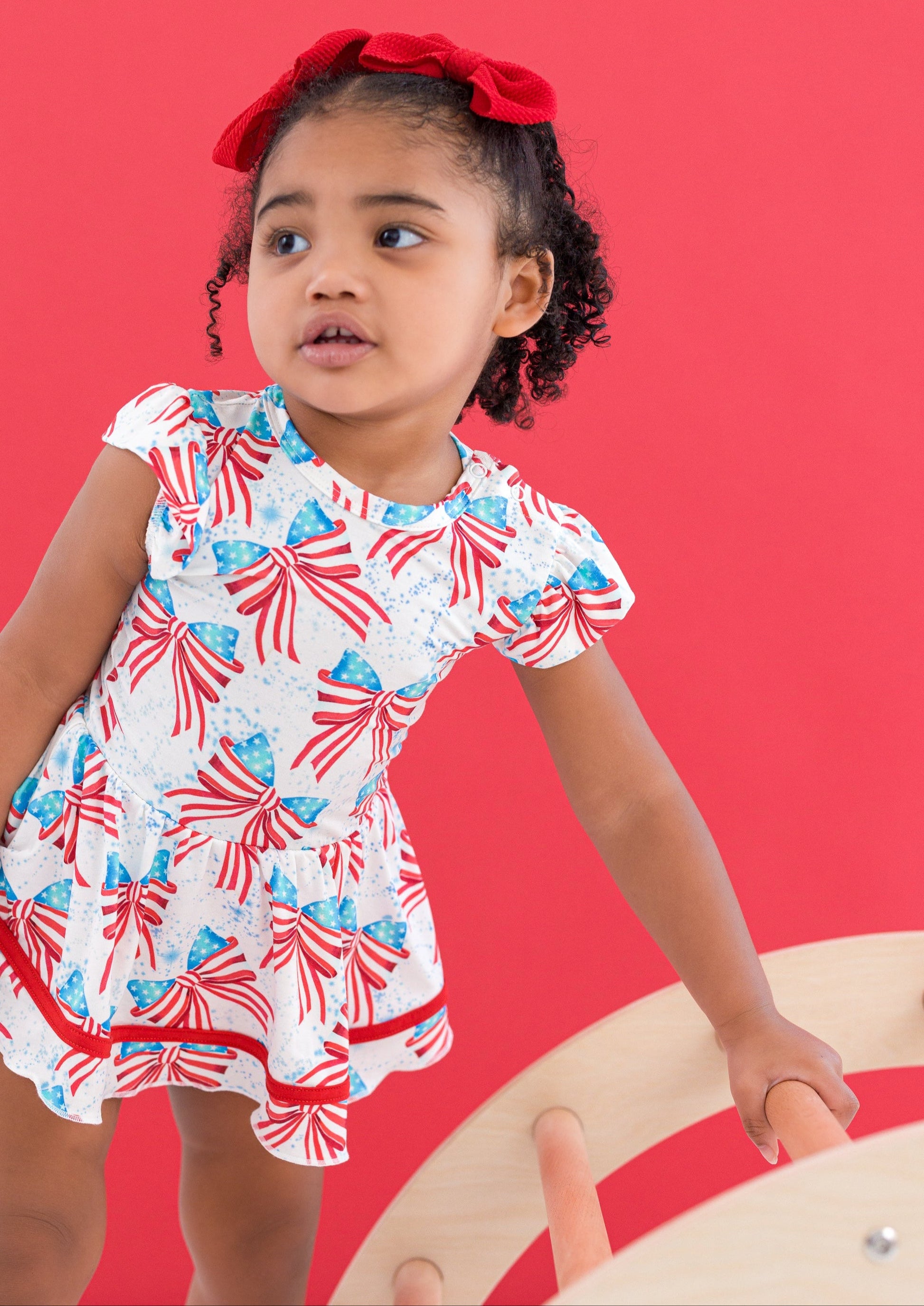 This sweet and spirited twirl dress is made for summer celebrations! Featuring an all-over print of patriotic bows, playful flutter sleeves, and a peplum-style skirt, it’s full of charm and comfort. Made from our signature bamboo viscose blend, this dress is lightweight, breathable, and incredibly soft—perfect for warm-weather fun and Fourth of July festivities!