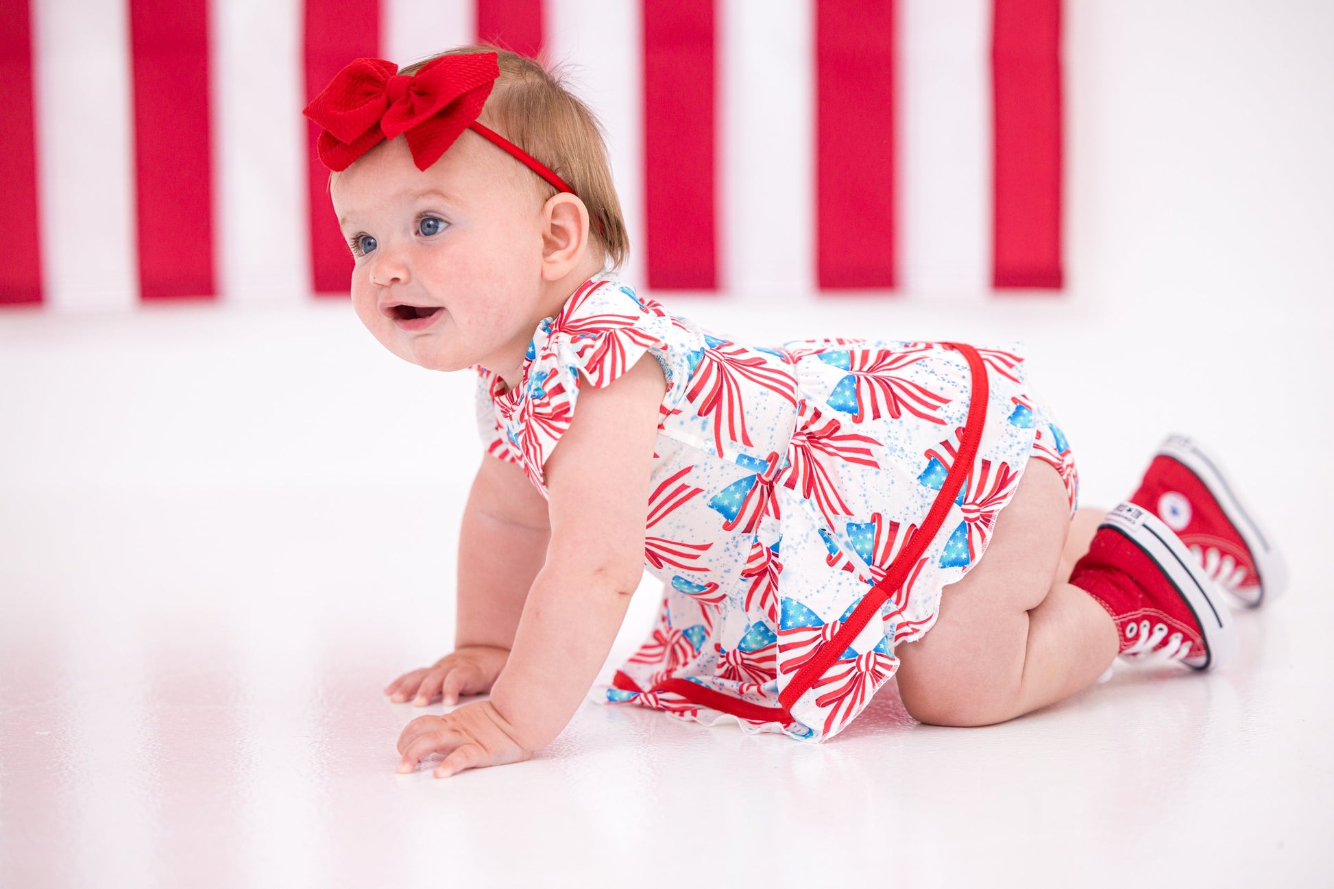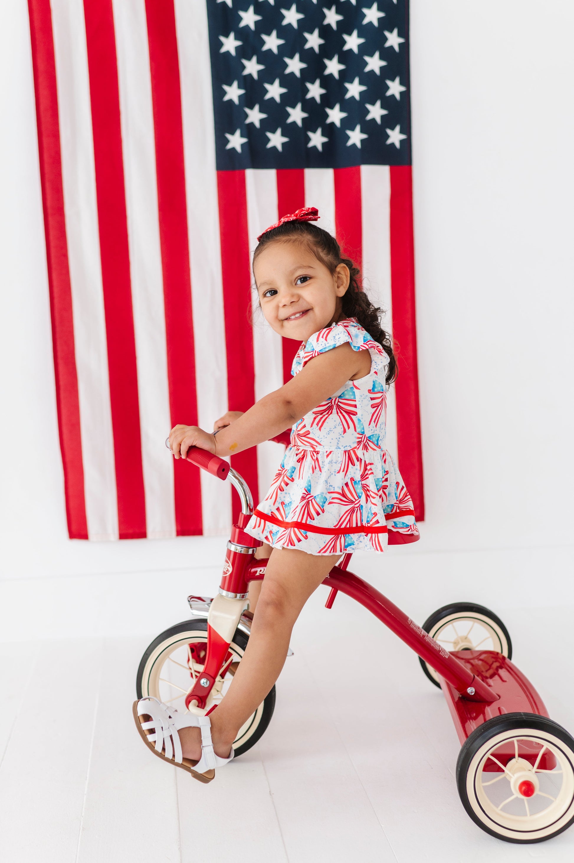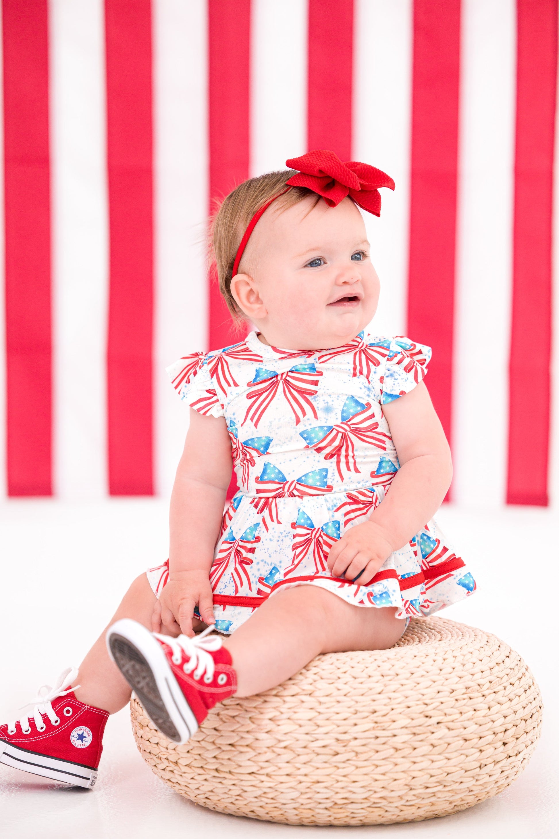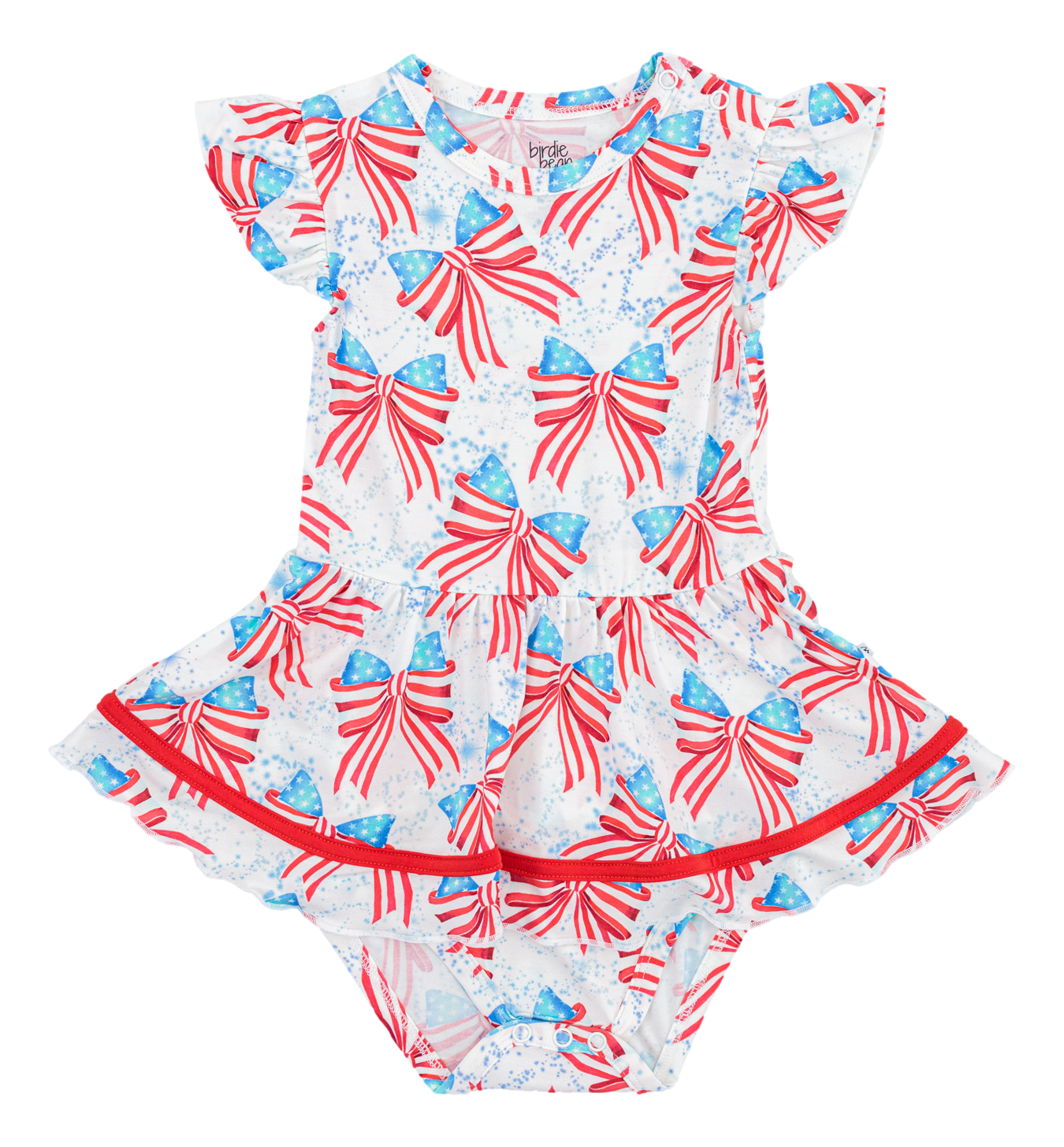 This sweet and spirited twirl dress is made for summer celebrations! Featuring an all-over print of patriotic bows, playful flutter sleeves, and a peplum-style skirt, it’s full of charm and comfort. Made from our signature bamboo viscose blend, this dress is lightweight, breathable, and incredibly soft—perfect for warm-weather fun and Fourth of July festivities!