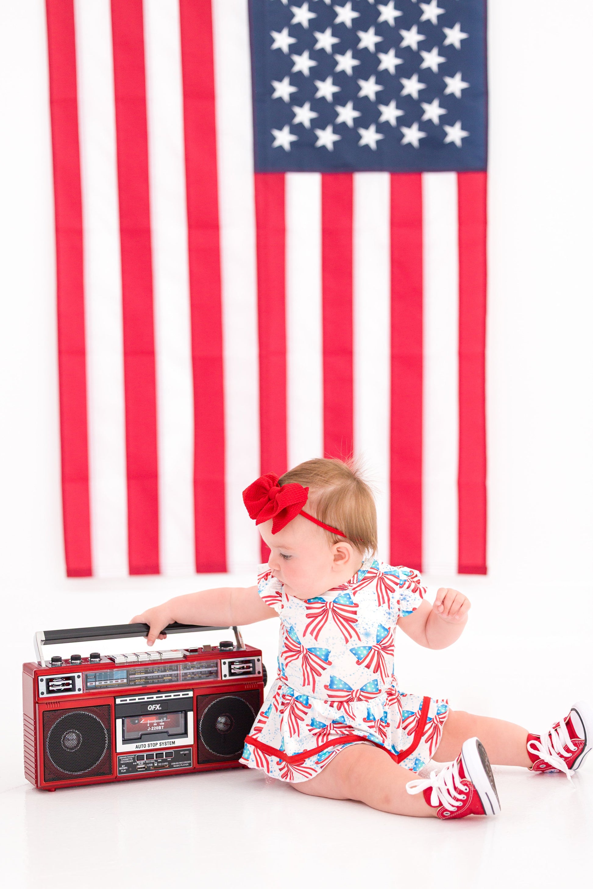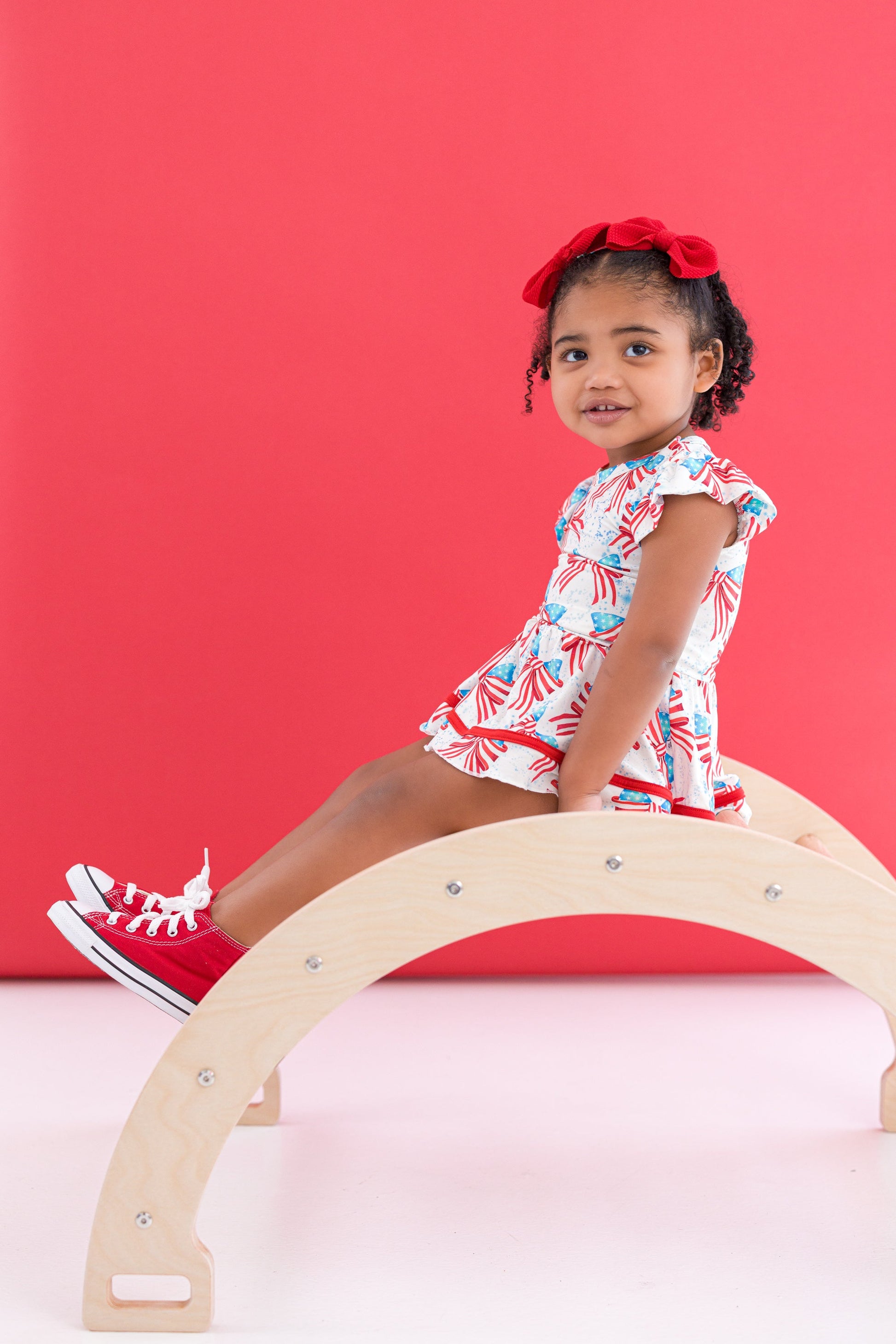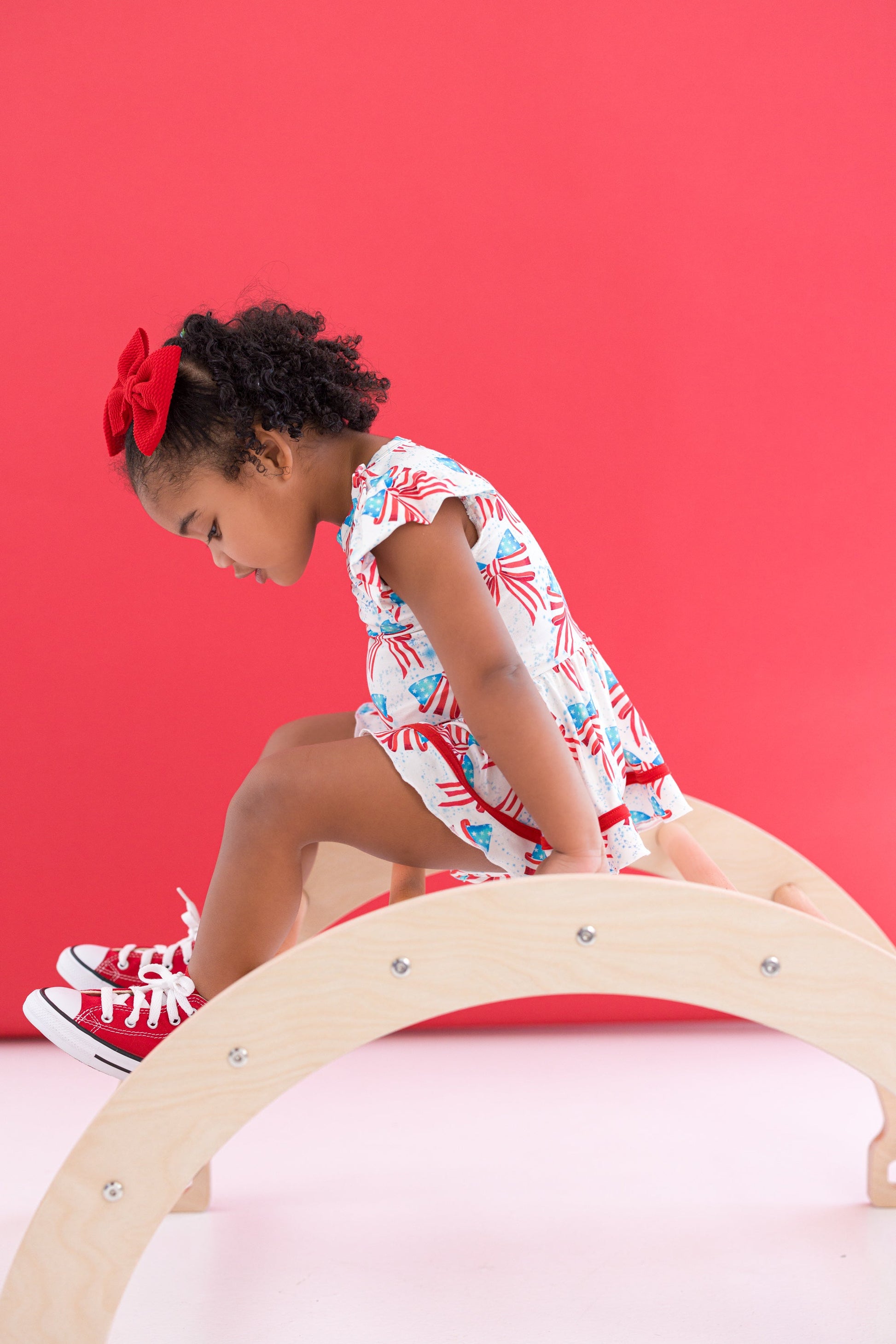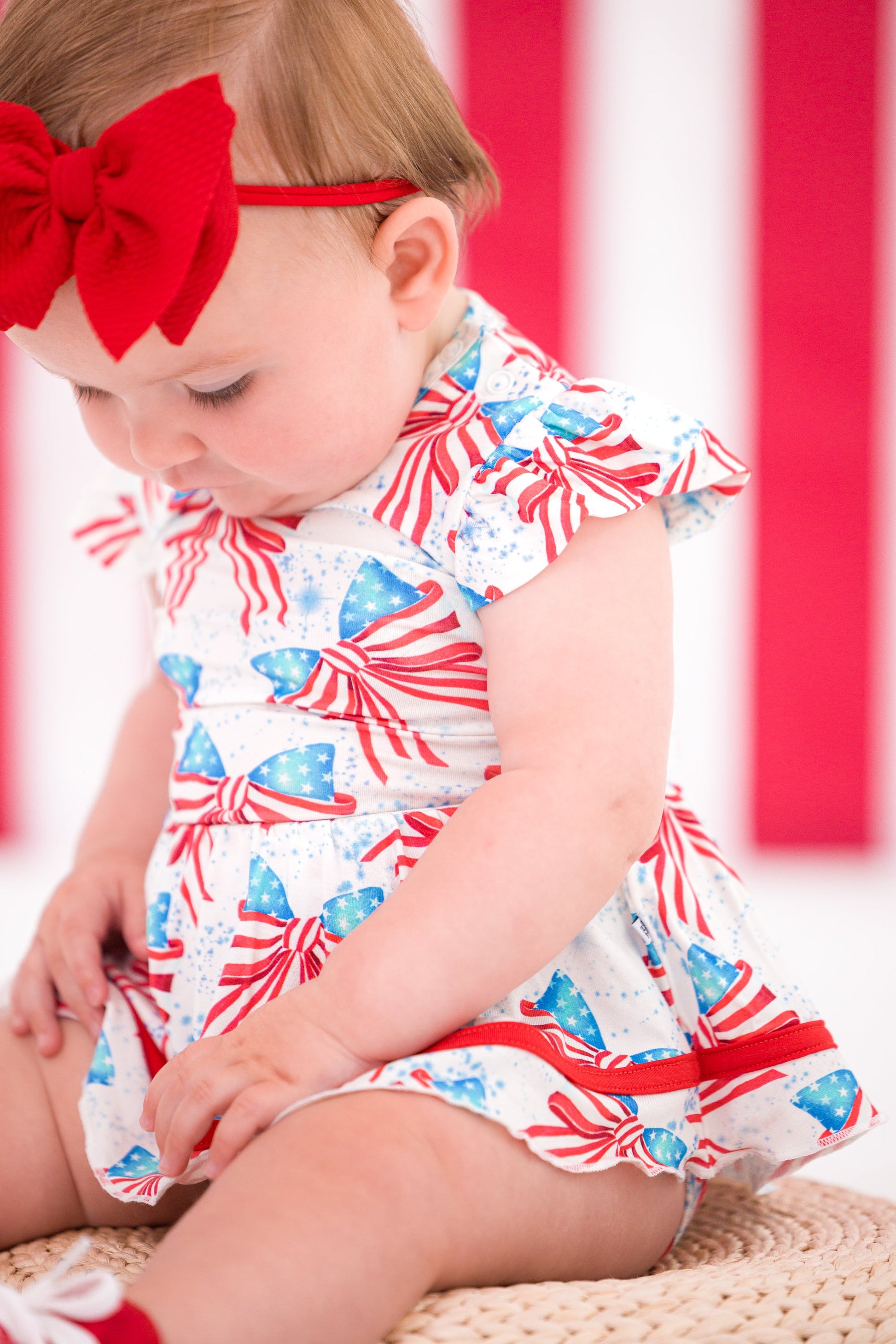 This sweet and spirited twirl dress is made for summer celebrations! Featuring an all-over print of patriotic bows, playful flutter sleeves, and a peplum-style skirt, it’s full of charm and comfort. Made from our signature bamboo viscose blend, this dress is lightweight, breathable, and incredibly soft—perfect for warm-weather fun and Fourth of July festivities!