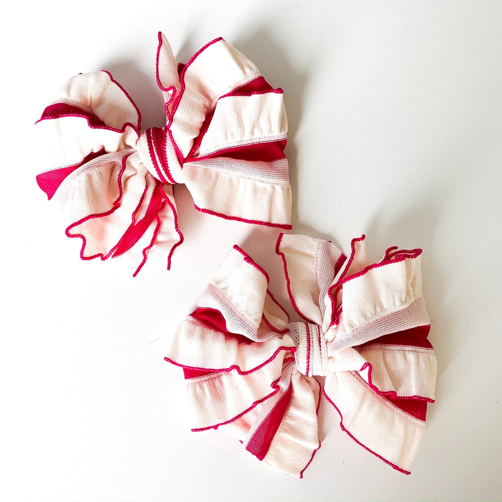 This sweet Ruffled Piggy Set in Berry and Cream adds a soft, delightful touch to your little girl's hairstyle! Crafted from our signature ruffled fabric, these clips feature a textured design that combines rich berry tones with creamy accents for a lovely pop of color. Each clip is securely attached to a metal clip and backed with soft felt for a comfortable, snug fit. Measuring 3.5 inches in width, these clips are the perfect size for pigtails, a timeless style that will stay adorable as your child grows. Keep your little one looking sweet and stylish with these charming Ruffled Clips from Rockin Royalty!