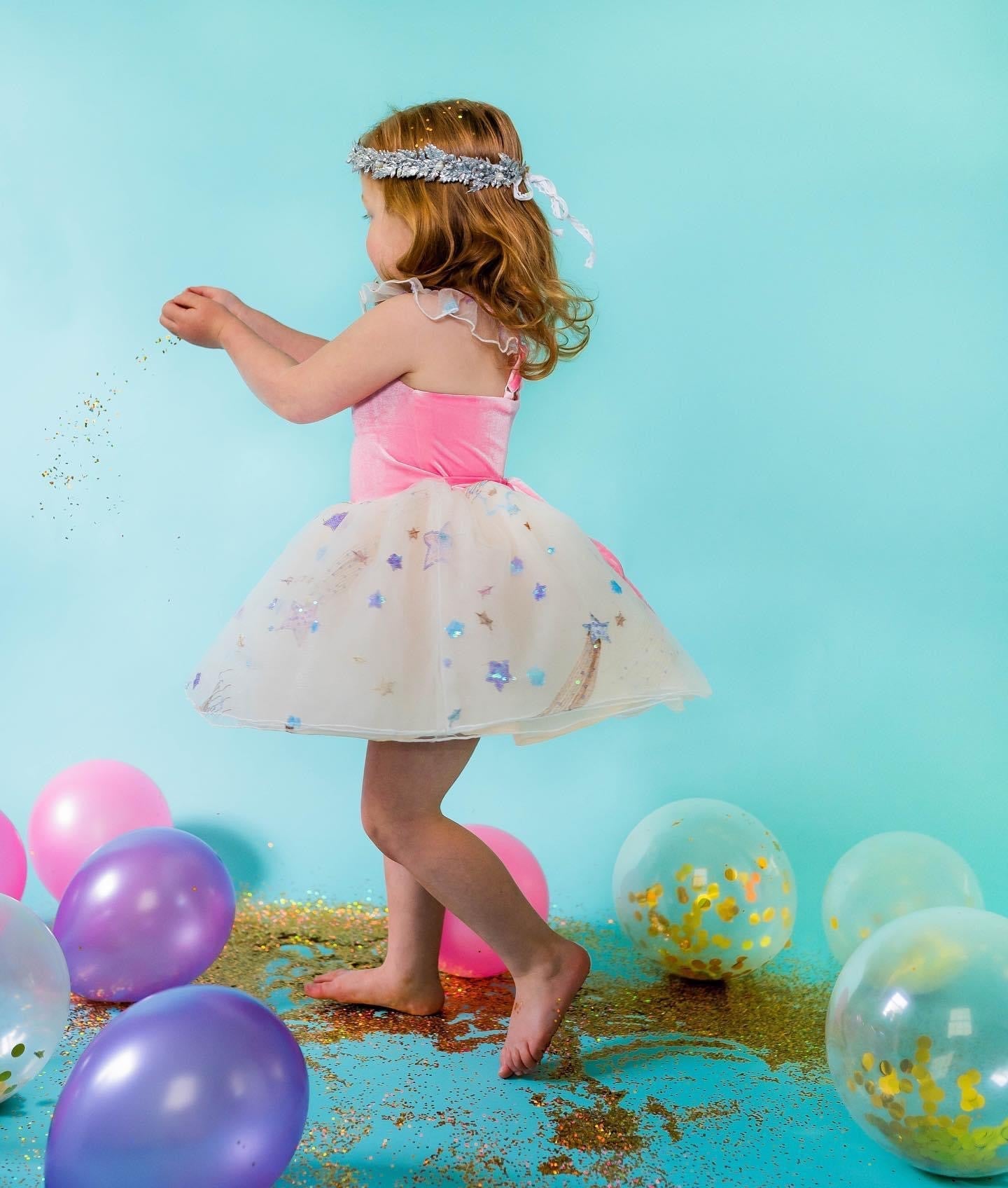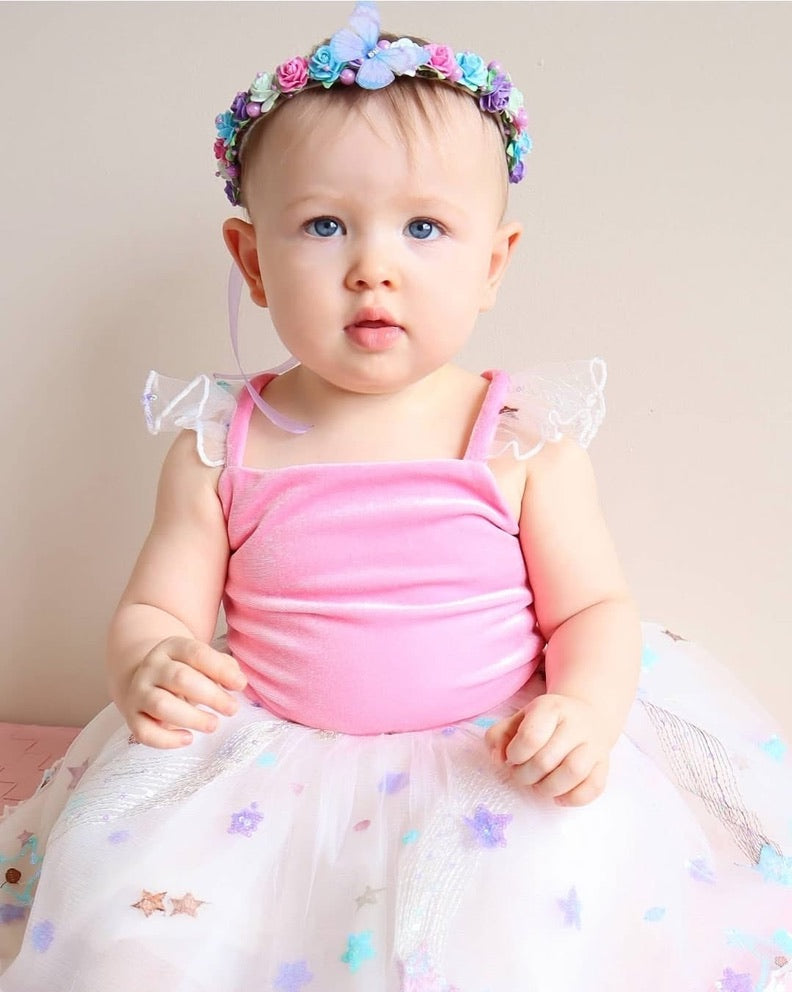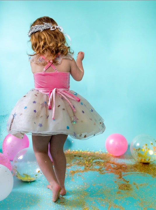 - Features velvet bodice with multi-layer tulle skirt and pink tie and adjustable straps to adjust fit