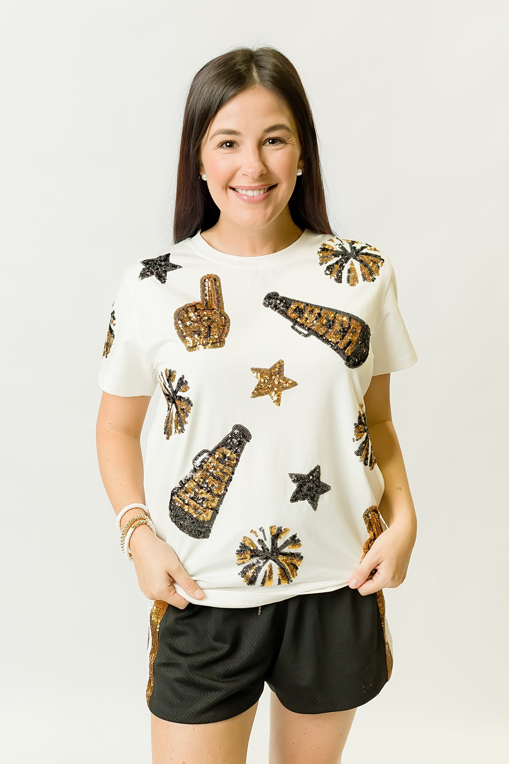 Show your team spirit in style with this Black and Gold Cheer Shirt! Its bold colors and comfortable fit make it perfect for cheering on your favorite squad or adding a fun pop to your casual wardrobe. Whether you're at the game or hanging out with friends, this shirt brings energy and flair to every moment.