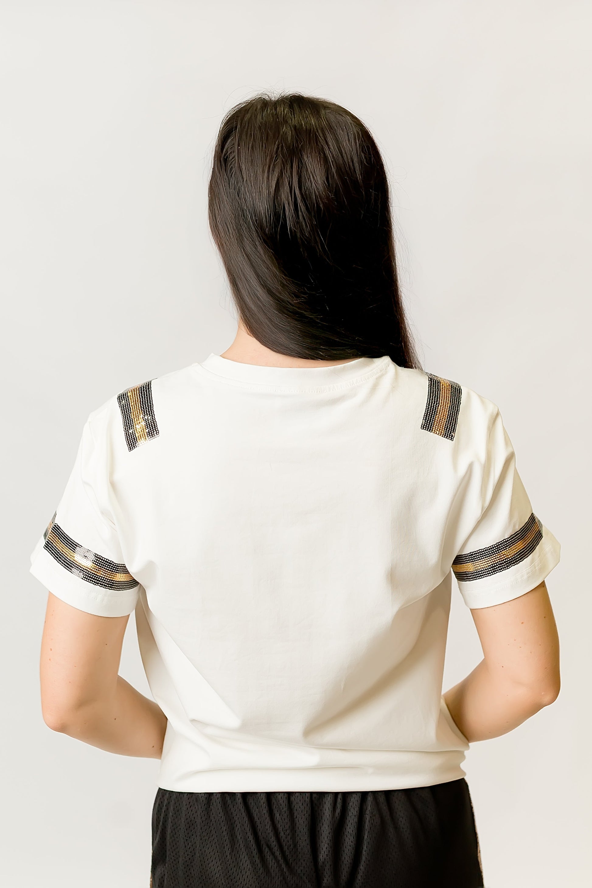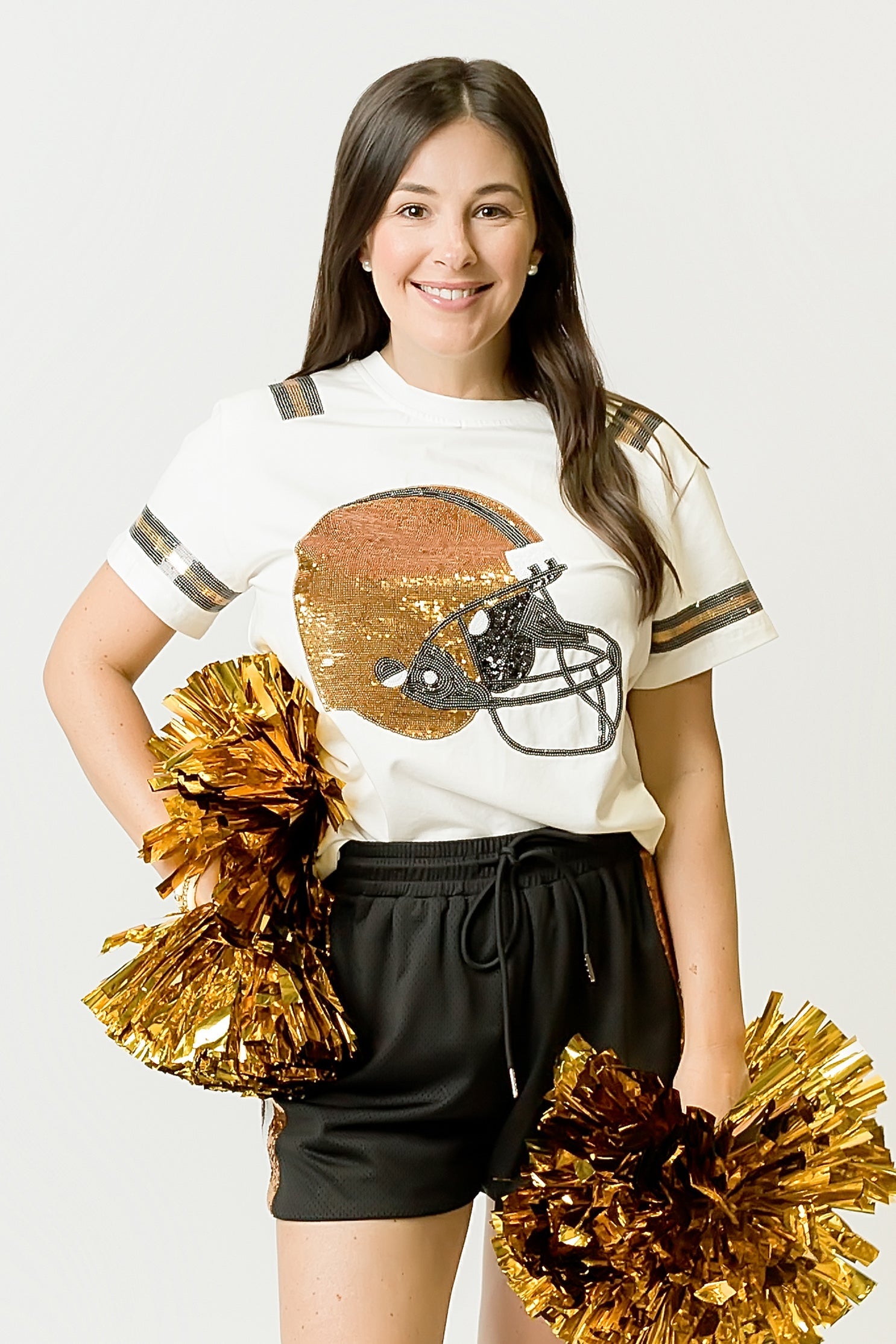 Get ready to turn heads with this Black and Gold Helmet Shirt! Its bold colors and striking design bring a fun, sporty vibe to your wardrobe. Perfect for game day or casual outings, this shirt adds a playful edge while keeping you comfortable and stylish. Show off your spirited side with a touch of gold flair!
