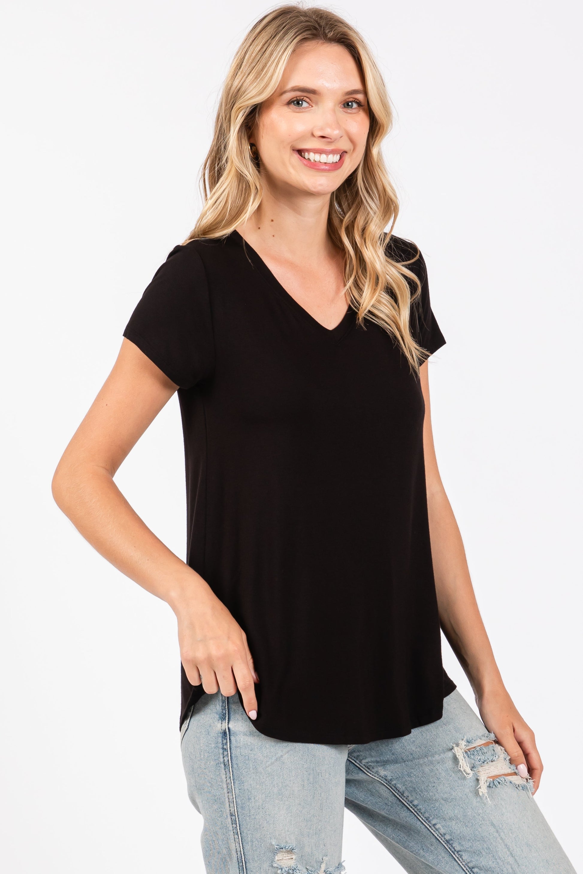 Black Basic V-Neck Short Sleeve Top