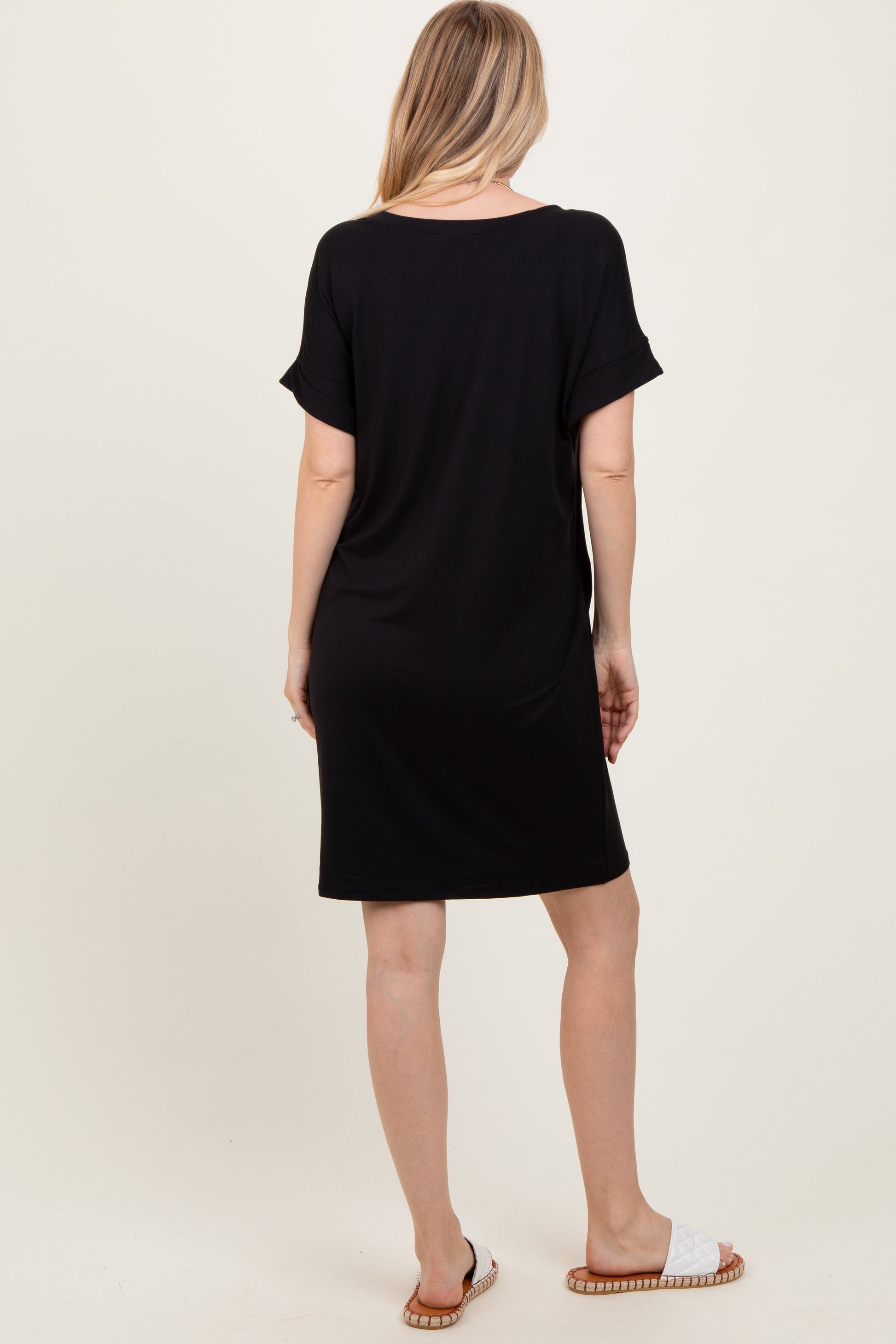 Black Brushed Rolled Short Sleeve V-Neck Dress