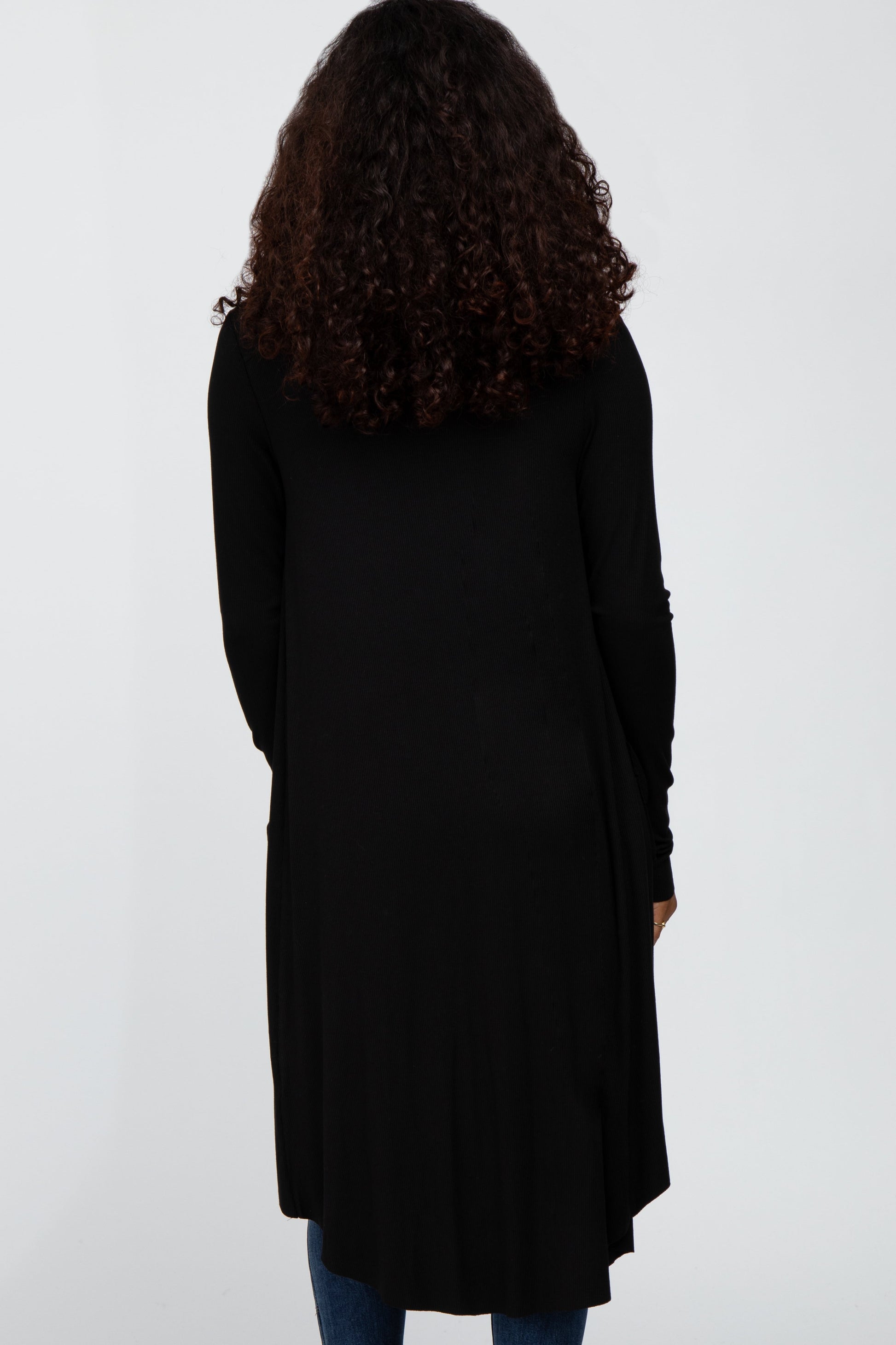 A solid hued cardigan featuring a button front closure, long sleeves, two pockets and hi-low hem.