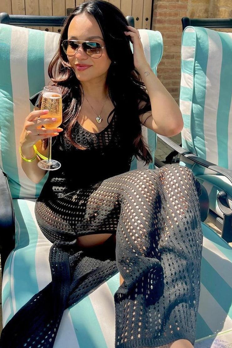 Elevate your beach or poolside look with this Black Crochet V-Neck Side Slit Cover Up. Featuring a stylish open-knit crochet design, this maxi cover up offers just the right amount of sheer coverage while keeping you cool. The flattering V-neckline and adjustable waist tie enhance your silhouette, while the high side slit adds a touch of allure and ease of movement. Lightweight and breathable, it's perfect for layering over your favorite swimsuit. Embrace effortless summer style and versatile comfort with this must-have cover up. One size fits most.