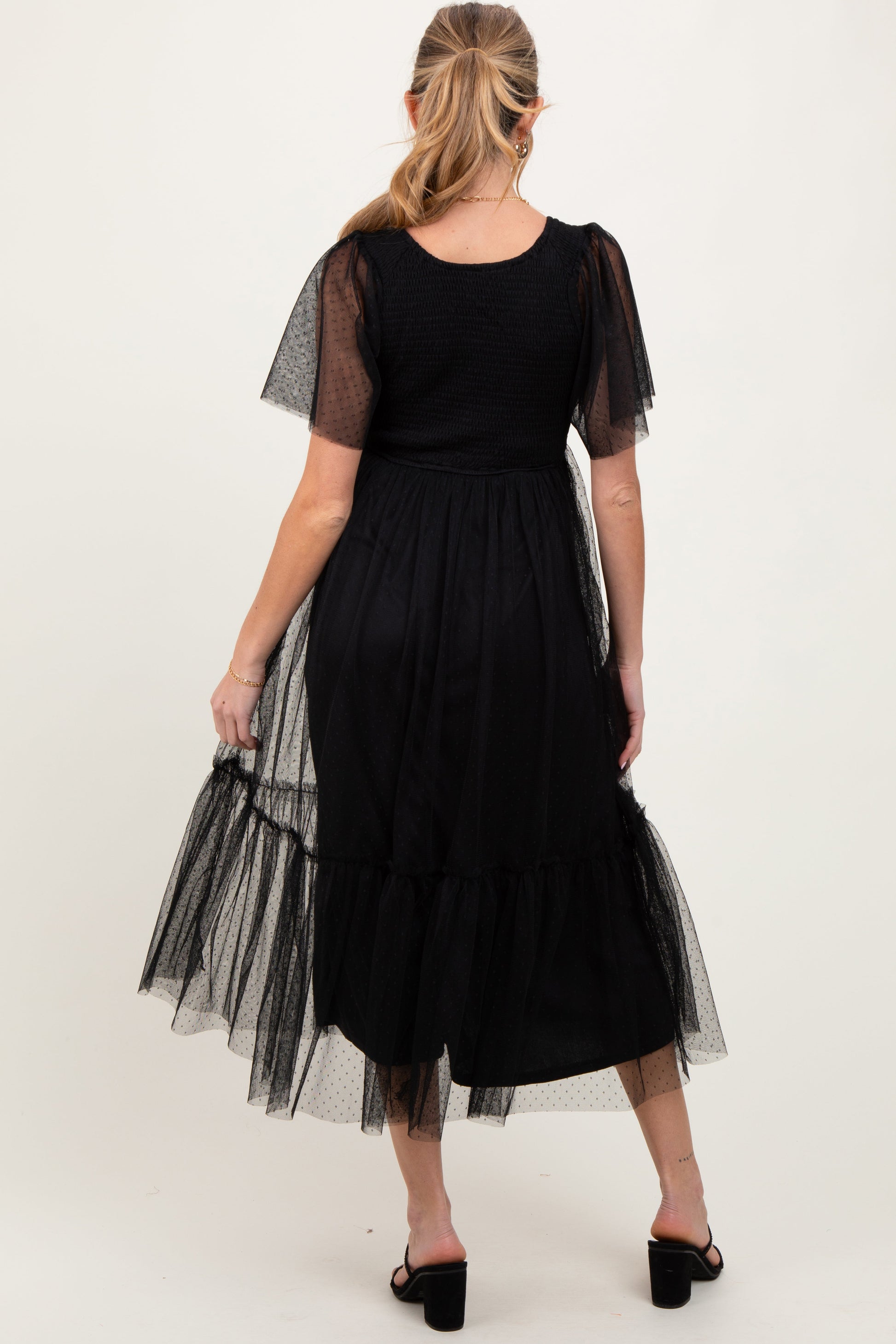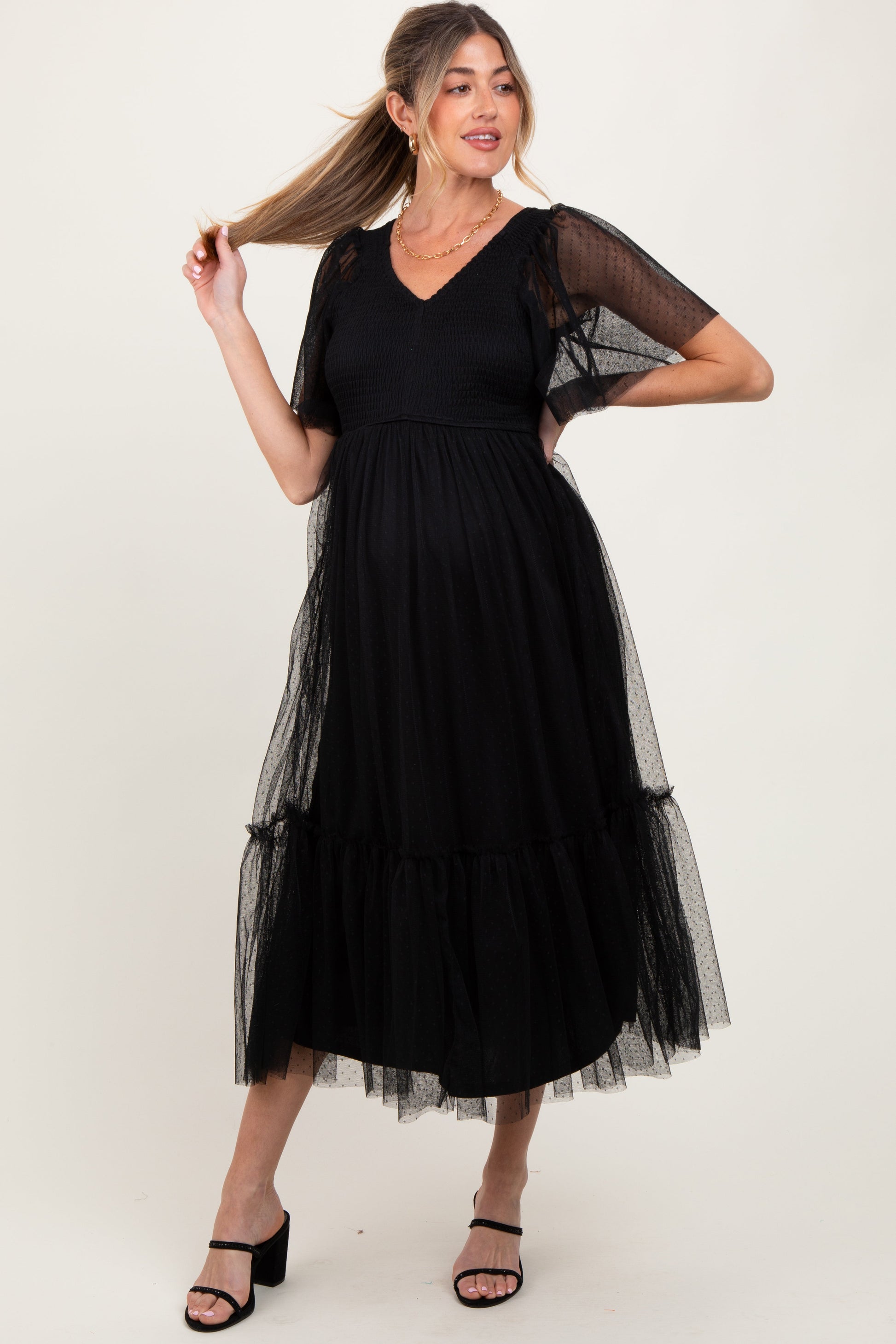 Black Dotted Tulle Smocked Maternity Midi Dress