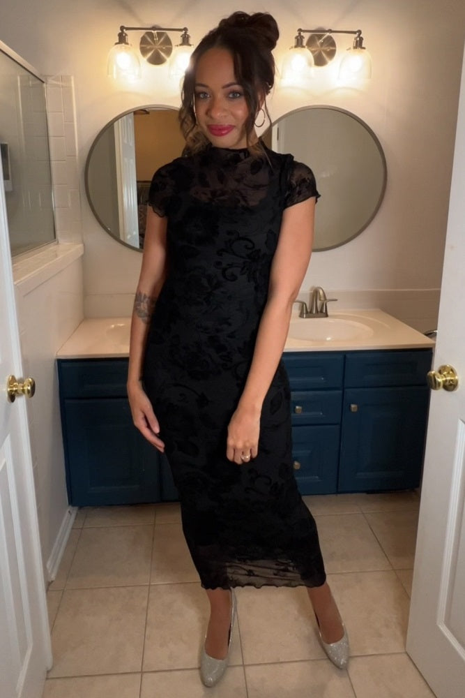 Elevate your evening look with this Black Floral Mesh Overlay Fitted Maxi Dress. Featuring a delicate floral mesh overlay that adds texture and elegance, this dress hugs your silhouette for a flattering fit. The high neckline and short sleeves offer a modest yet sophisticated touch, while the sheer details create subtle allure. Perfect for formal events, dinners, or special occasions, this maxi dress pairs effortlessly with heels and statement jewelry. Step into timeless style with this must-have piece that combines classic charm and modern flair. Available in multiple sizes.