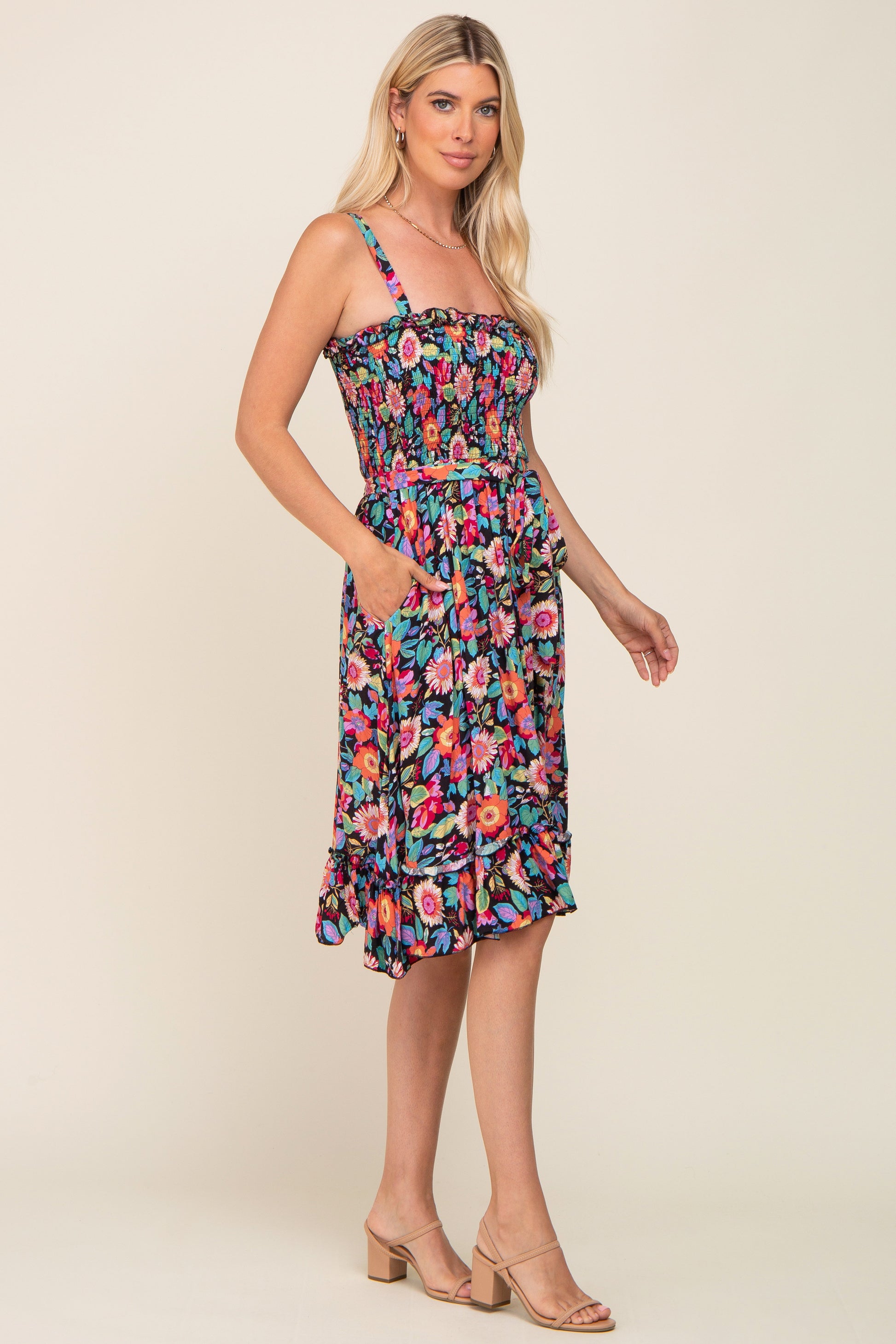 A floral sleeveless dress featuring adjustable shoulder straps, a smocked top, a self-tie waist, a ruffle hem and a ruffle neckline.