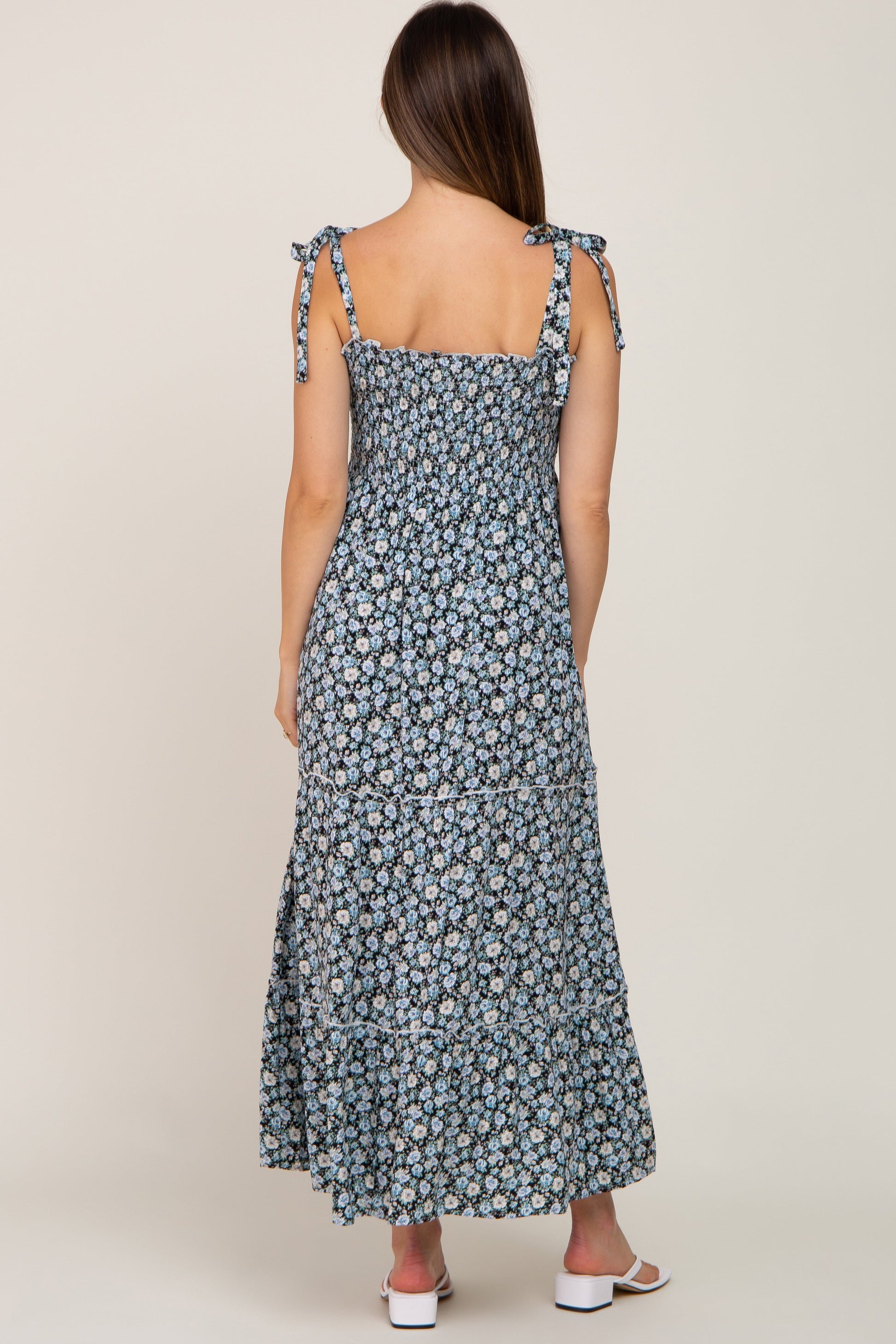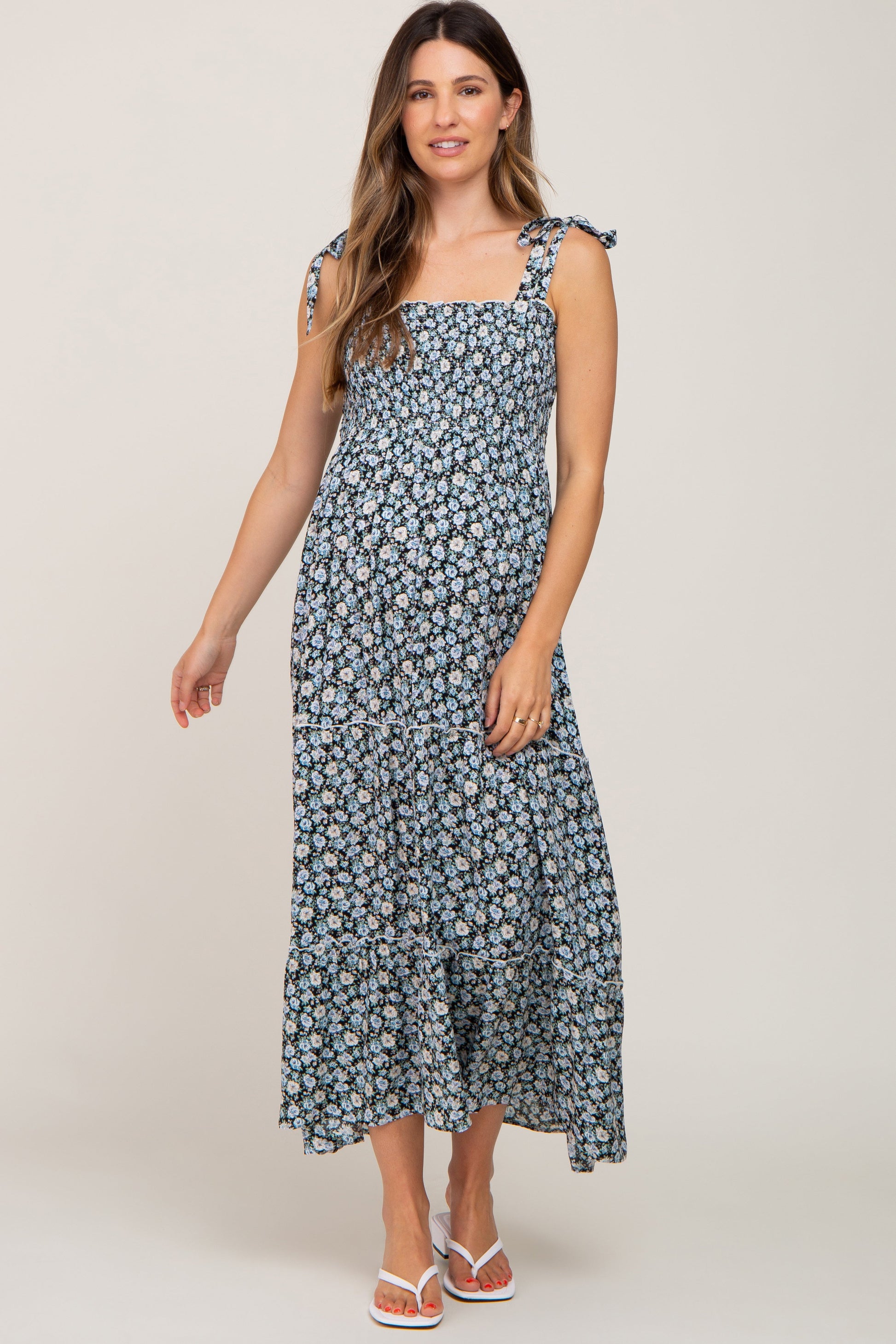 A floral sleeveless maternity maxi dress featuring self-tie shoulder straps, a smocked top, a tiered skirt, side pockets and a square neckline.