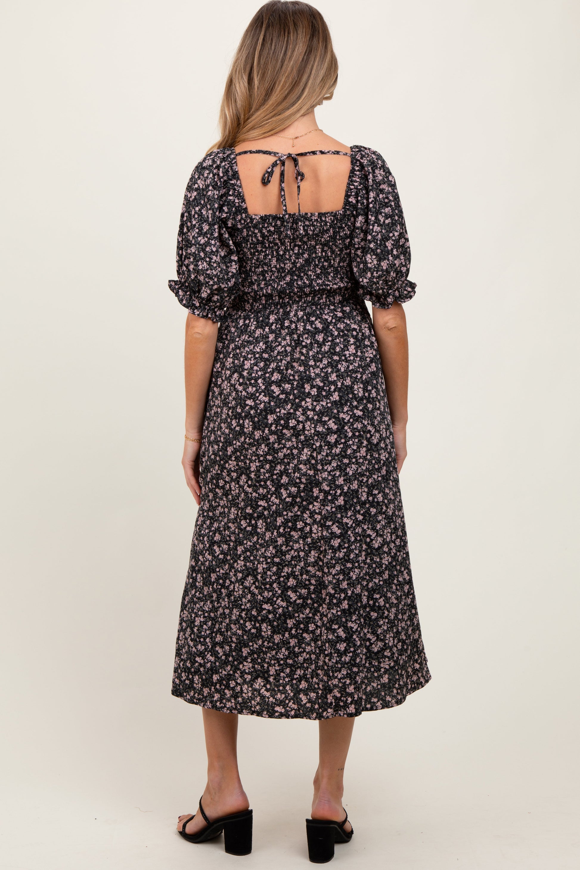Black Floral Smocked Puff Sleeve Maternity Midi Dress