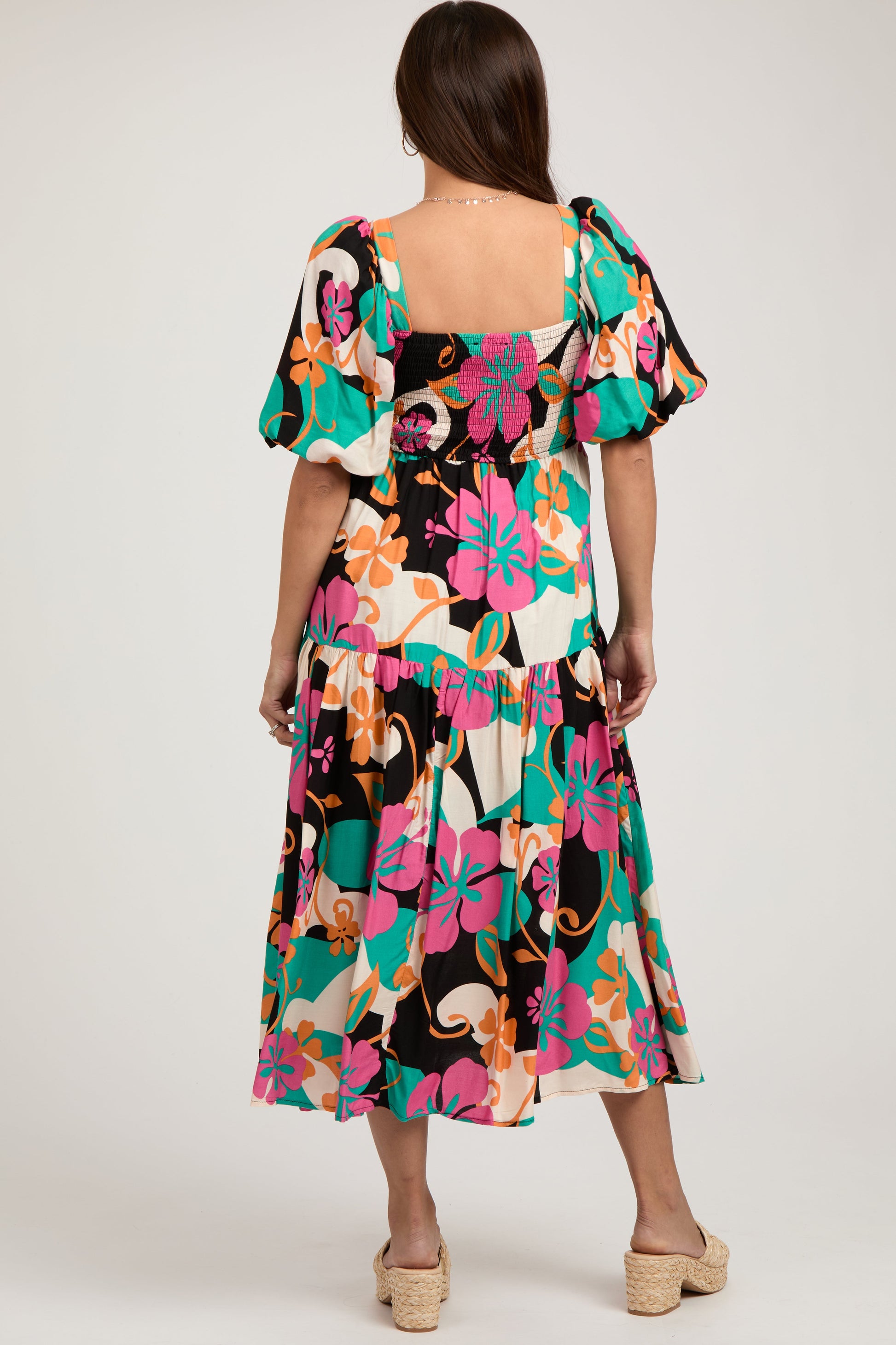 A floral print maternity midi dress featuring short puff sleeves, a tiered skirt, a smocked back and a square neckline.