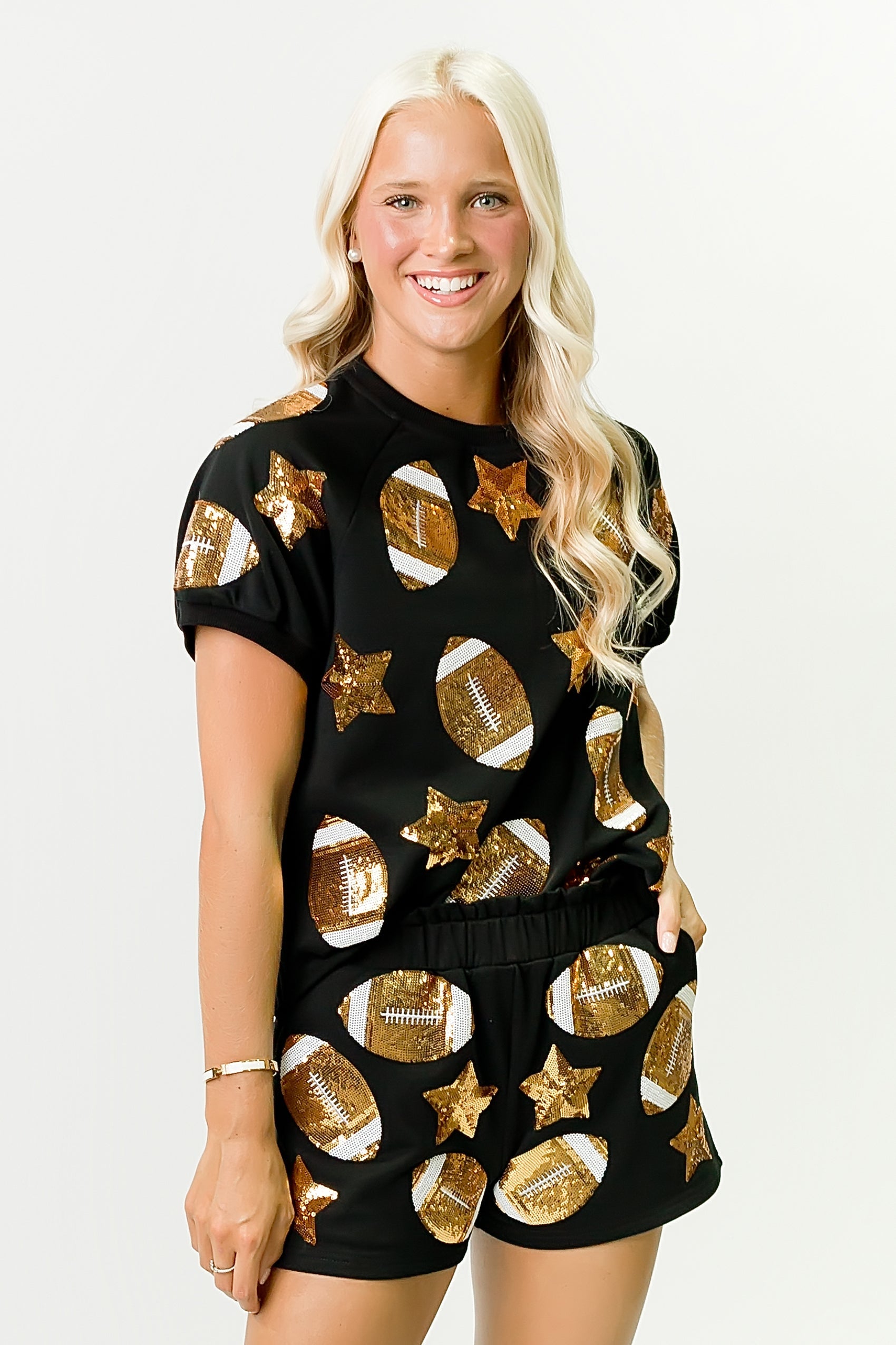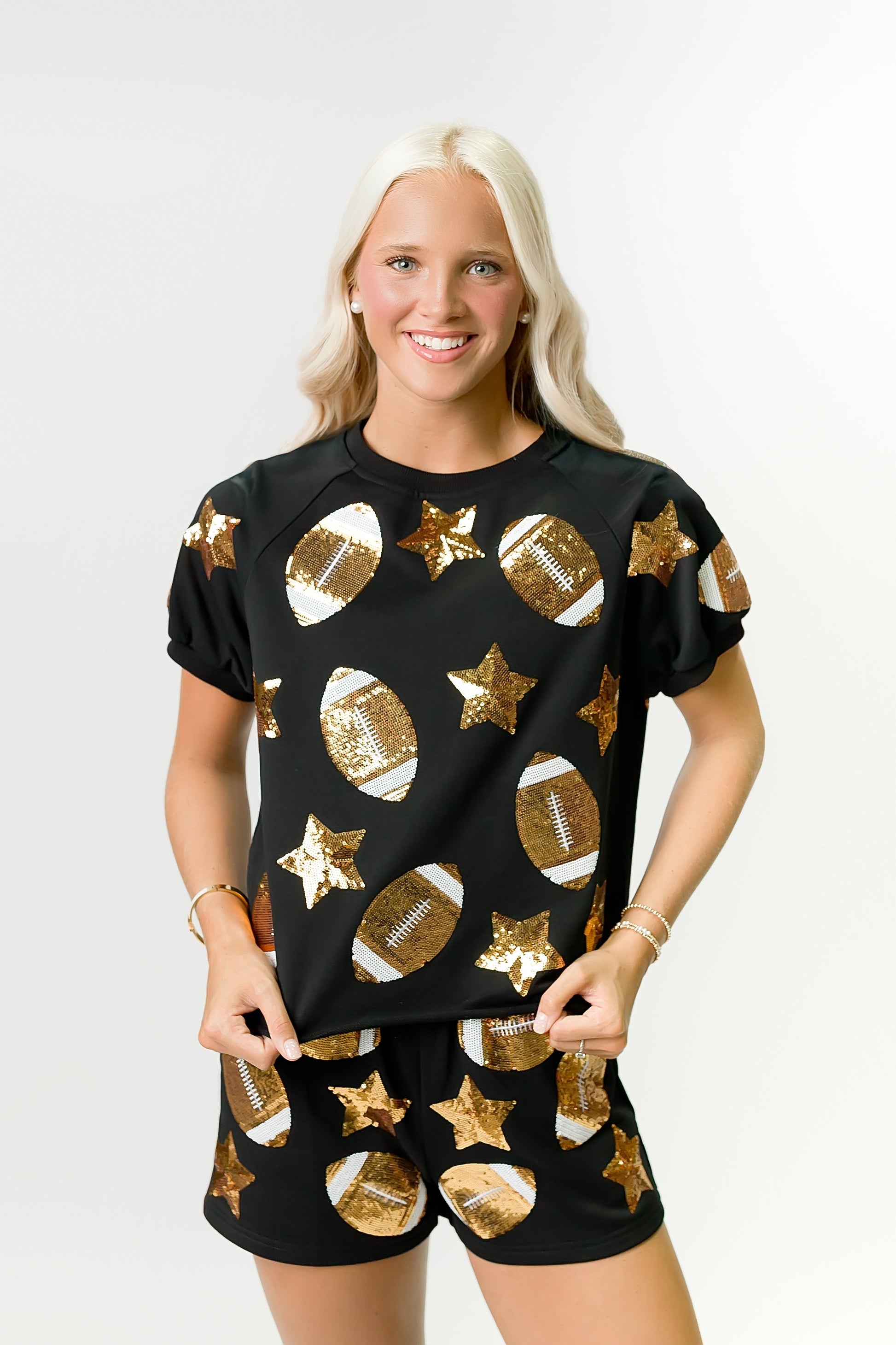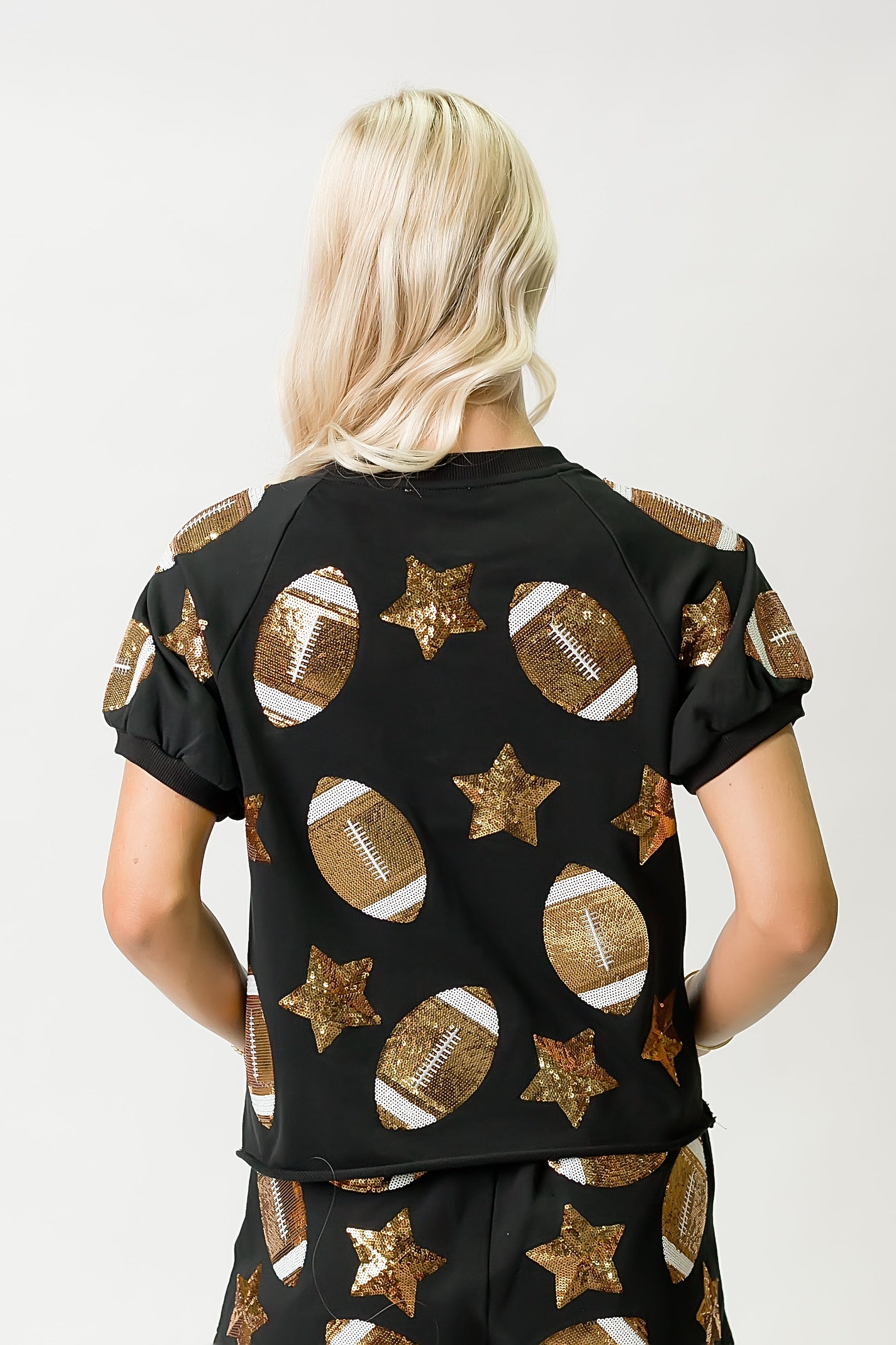 Shine bright on game day with this Black Football Sequin Top! Covered in sparkling sequins that catch every light, itโs perfect for showing off your team spirit with a fun, festive twist. Pair it with your favorite jeans or skirt for a playful look that scores style points wherever you go.