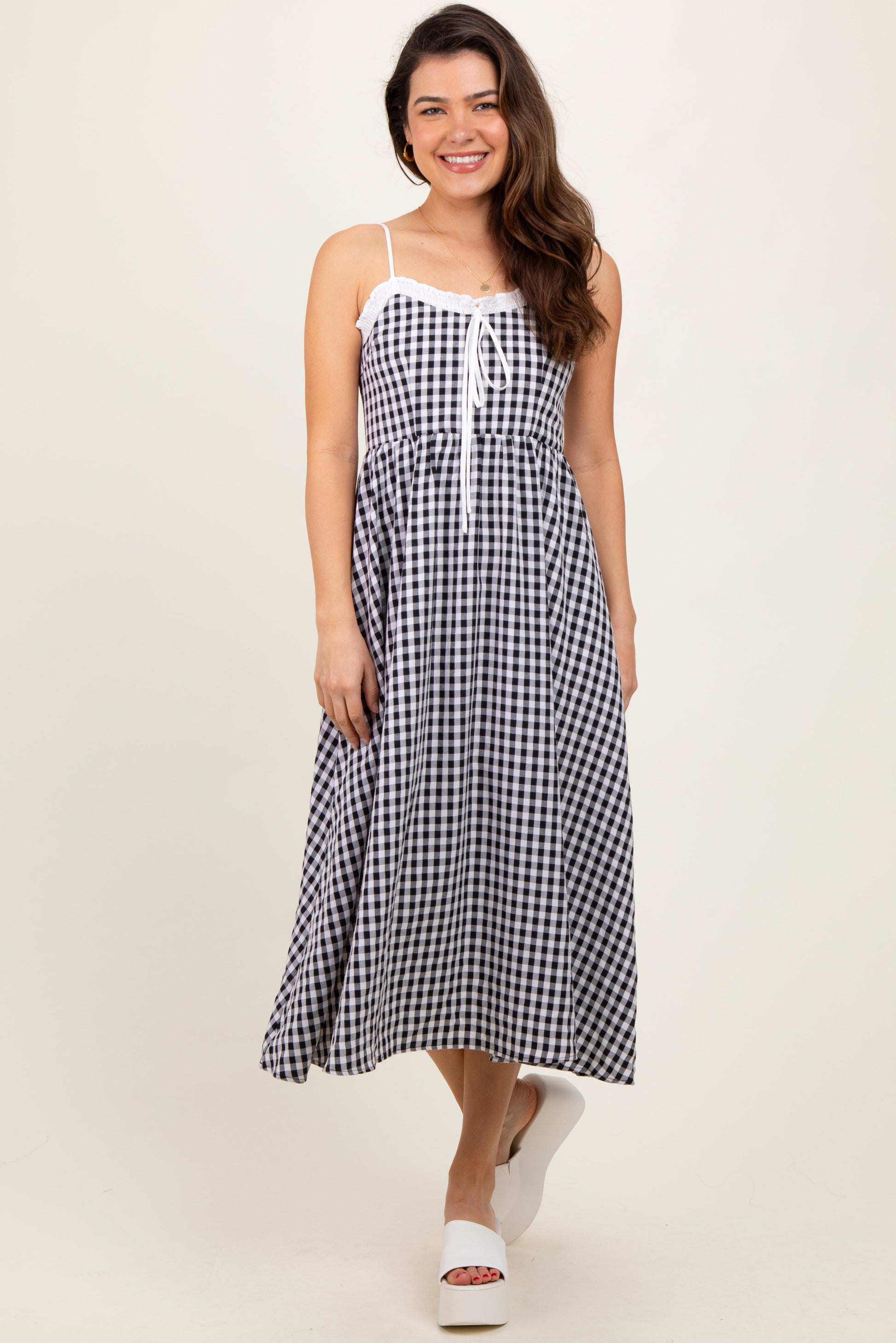 Black Gingham Smocked Trim Midi Dress