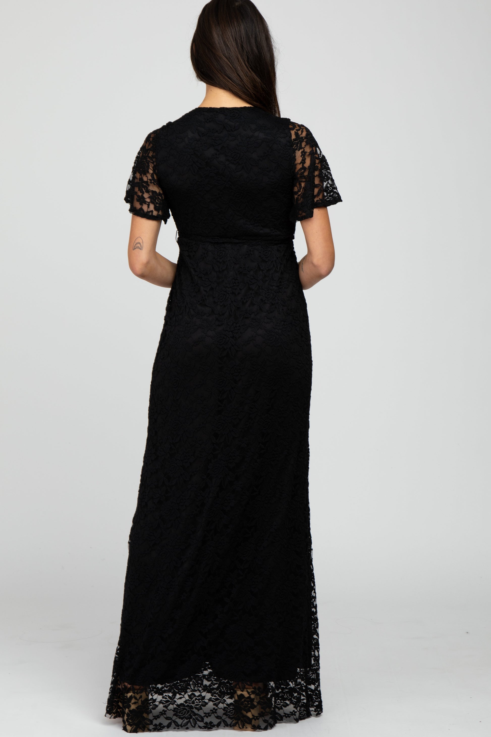 A lace maxi dress with short flowy sleeves, a front tie, and a v-neckline. Body is lined to prevent sheerness.