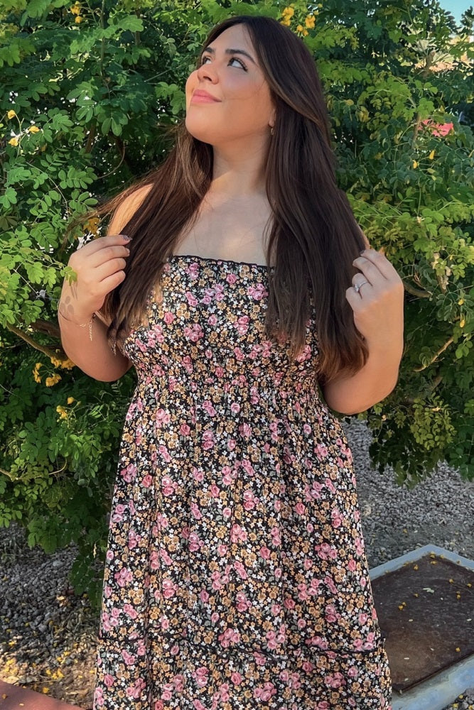 A floral sleeveless maxi dress featuring self-tie shoulder straps, a smocked top, a tiered skirt, side pockets and a square neckline.