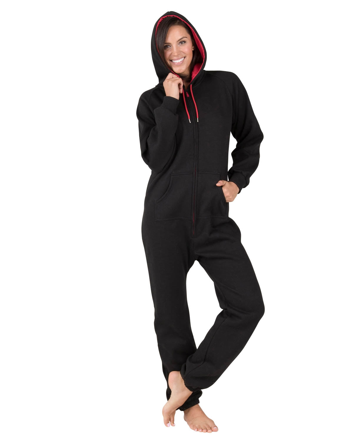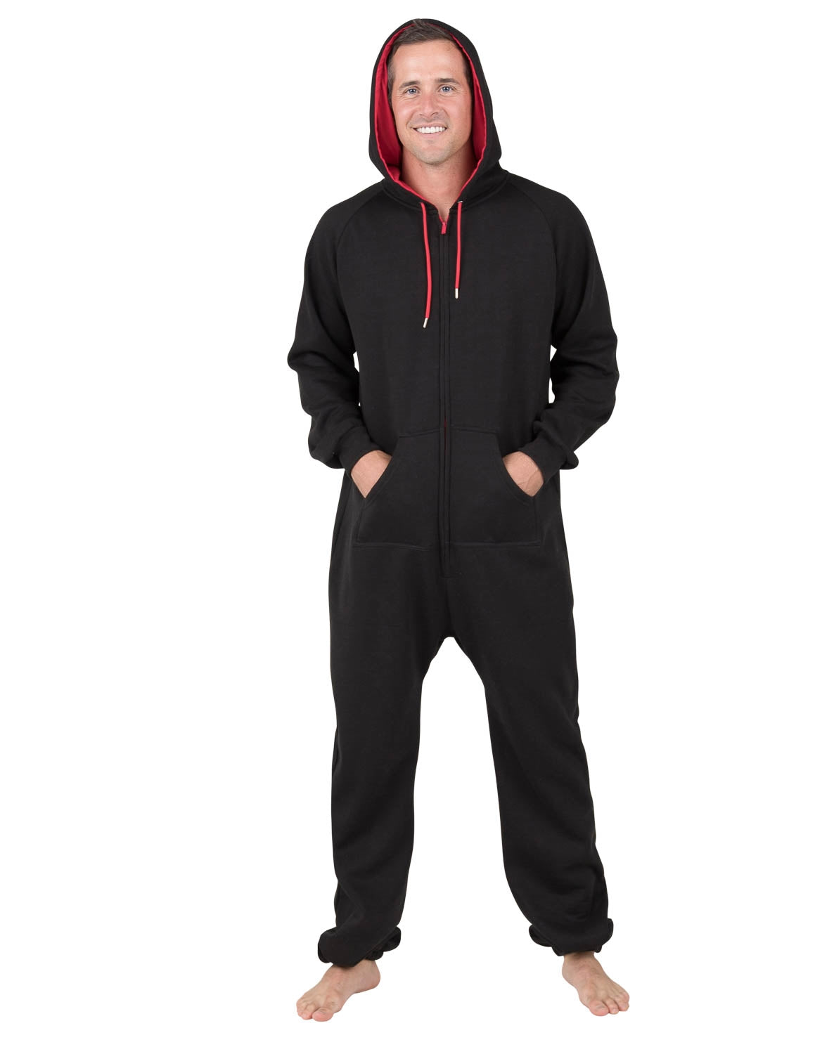 The perfect mix between a track suit and one piece pajamas! Black sweat shirt fleece with red accents on hoodie lining, drawstrings and the zipper make these joggers extra stylish! Roll out of bed ready for the day! Great for sleeping in and as laid-back outerwear! Both women and men will love and look gorgeous in these onesie’s for adults.