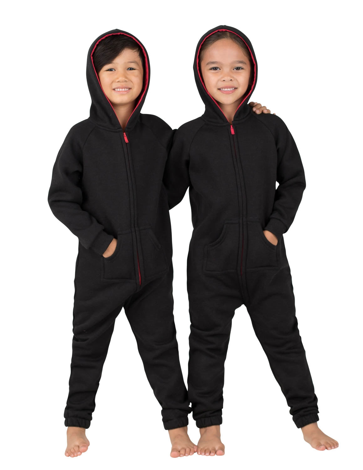 The perfect mix between a track suit and one piece pajamas! Black sweat shirt fleece with red accents on the hoodie lining and zipper make these joggers extra stylish! Roll out of bed ready for the day! Great for sleeping in and as laid-back outerwear! Girls and boys will love and look gorgeous in these onesie’s for kids.