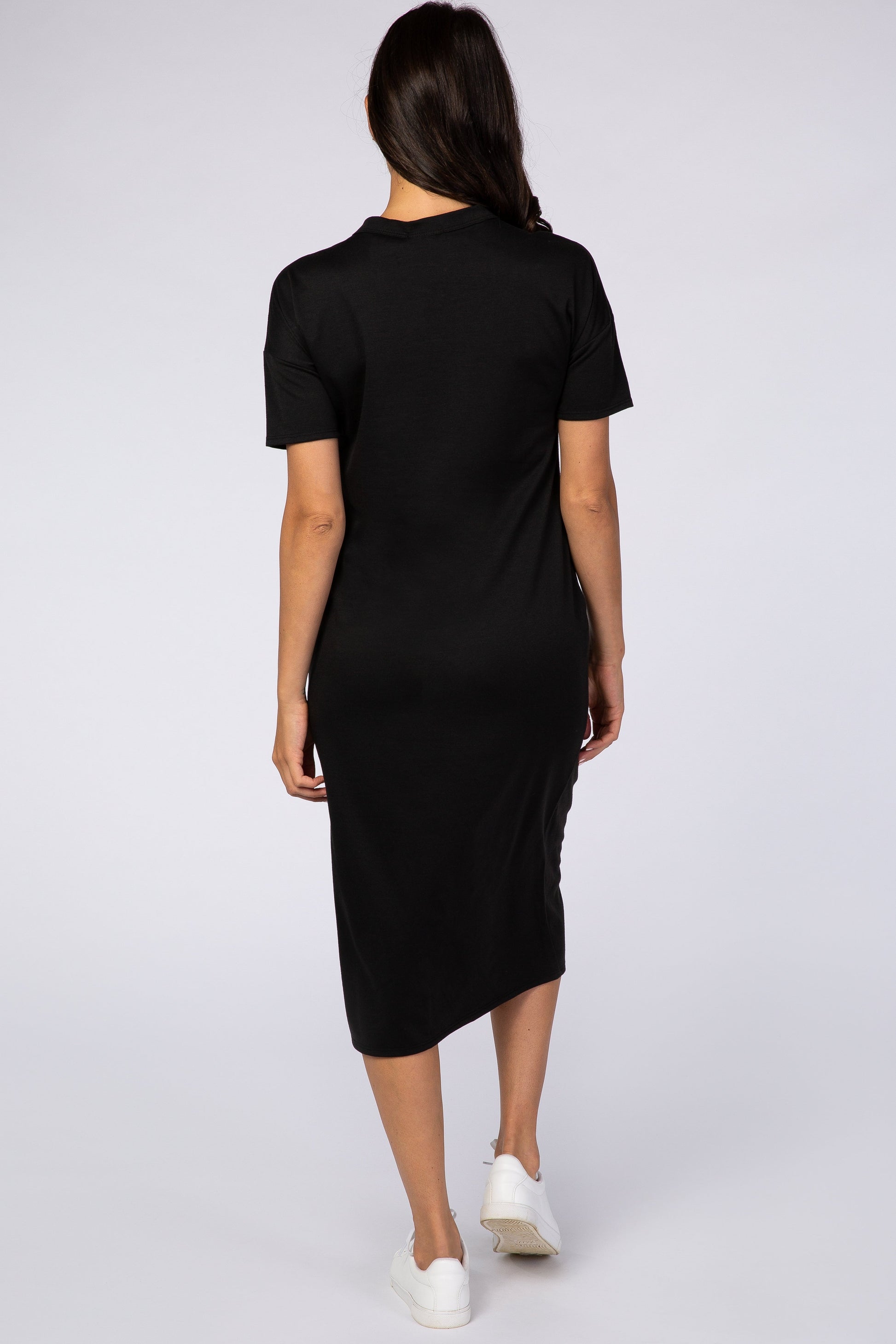 Black Short Sleeve V-Neck Button Detail Midi Dress