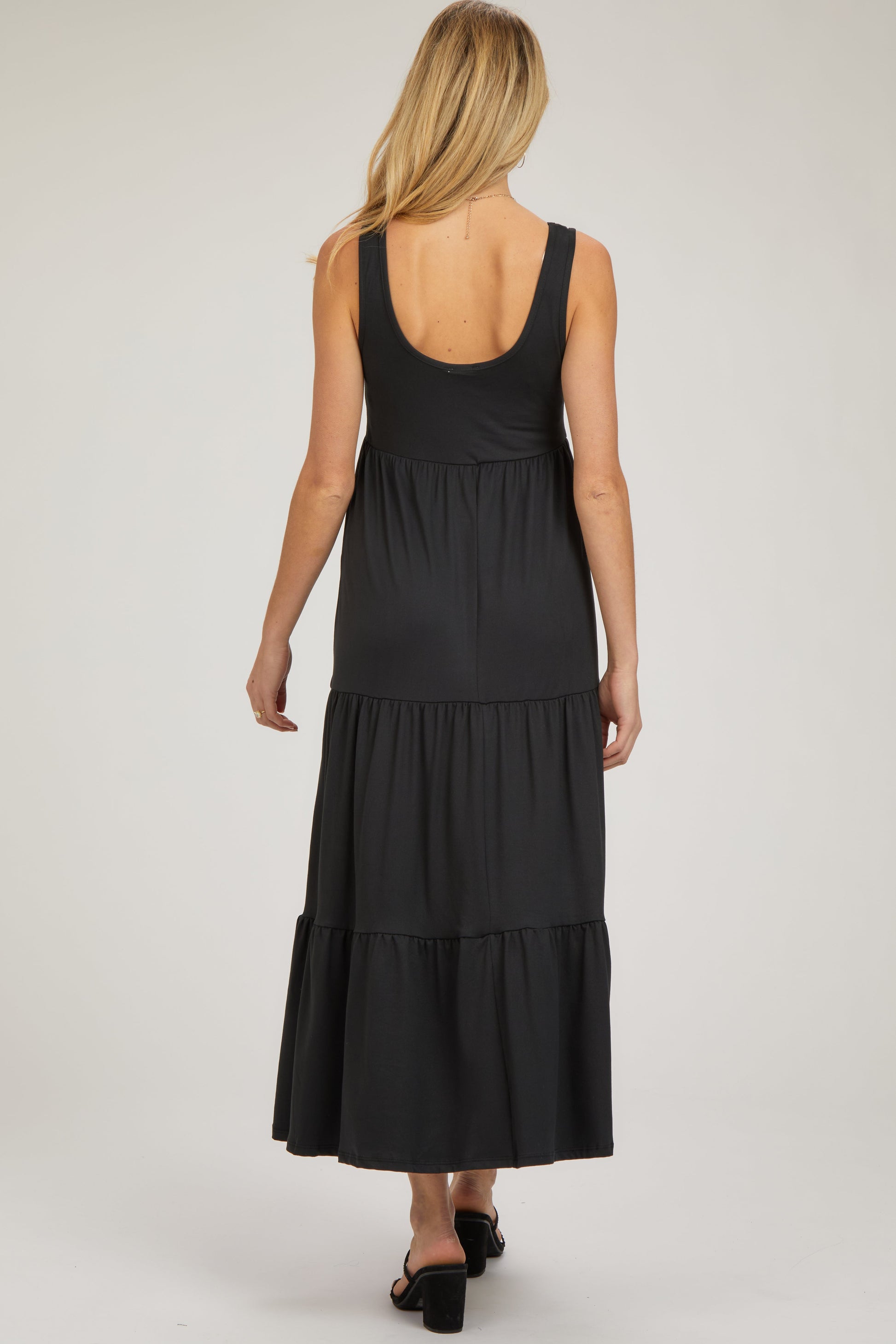 Black Sleeveless Scoop Back Tiered Maternity Maxi Dress