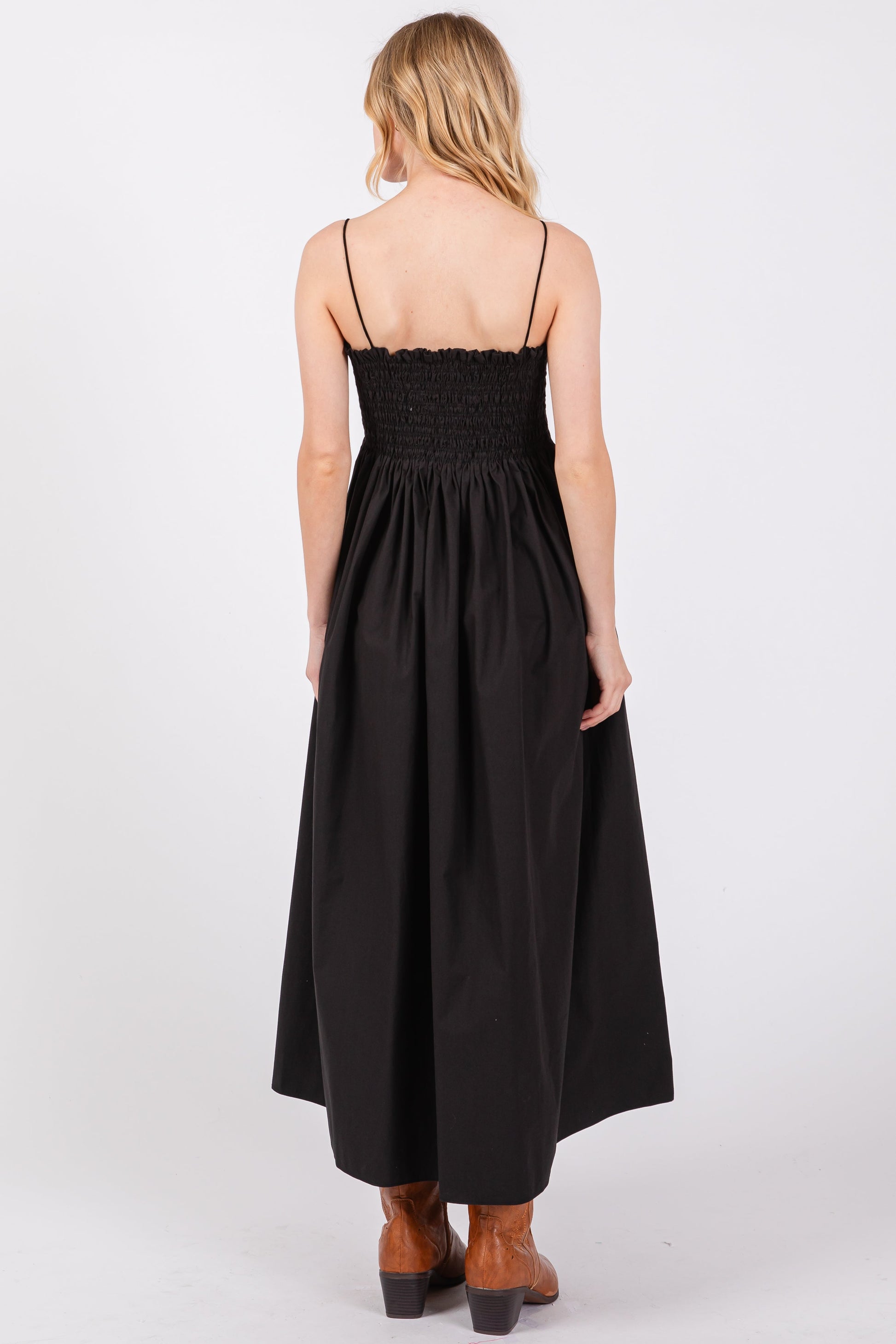 Black Smocked Pocketed Midi Dress