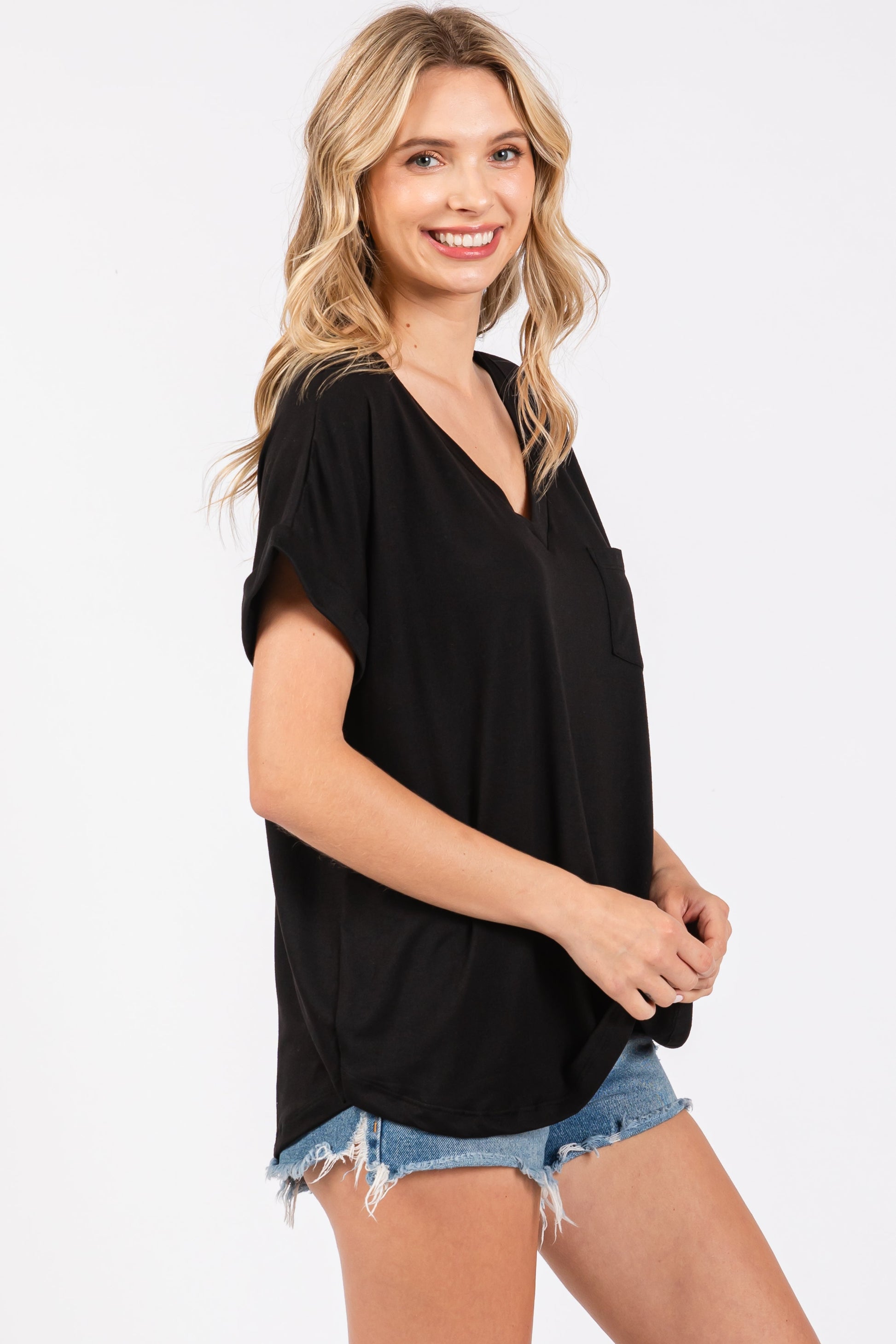 Elevate your casual wardrobe with this Black V-Neck Pocket Short Sleeve Shirt, designed for effortless style and comfort. Crafted from soft, breathable fabric, it features a relaxed fit with a flattering V-neckline and rolled short sleeves for a trendy touch. The subtle front pocket adds a hint of detail while maintaining the minimalist look. Perfect for pairing with denim shorts or your favorite jeans, this versatile shirt is ideal for everyday wear or laid-back weekends. Easy to dress up or down, it’s a must-have staple that combines simplicity with chic. Available in multiple sizes.