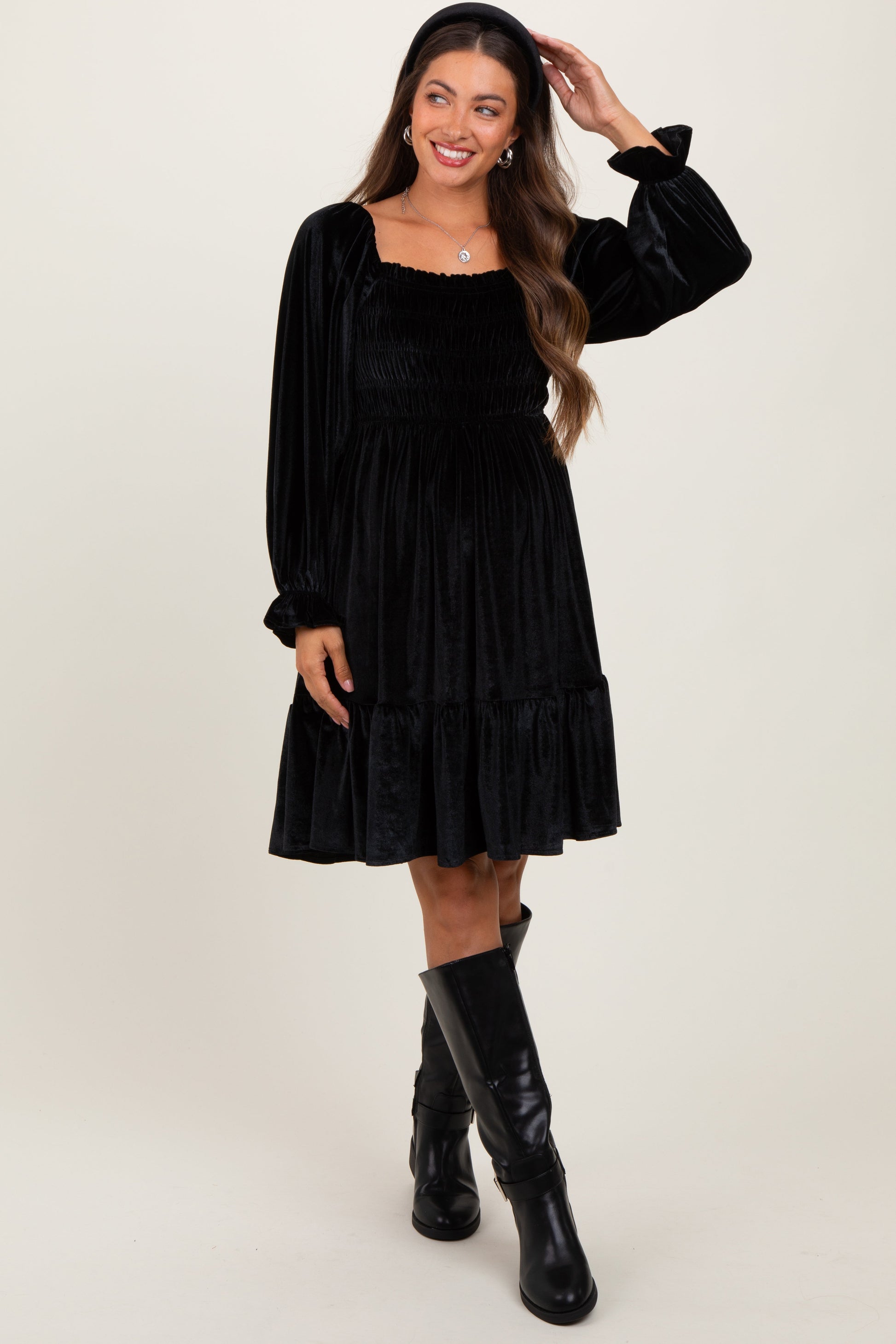 Black Velvet Smocked Long Sleeve Maternity Dress