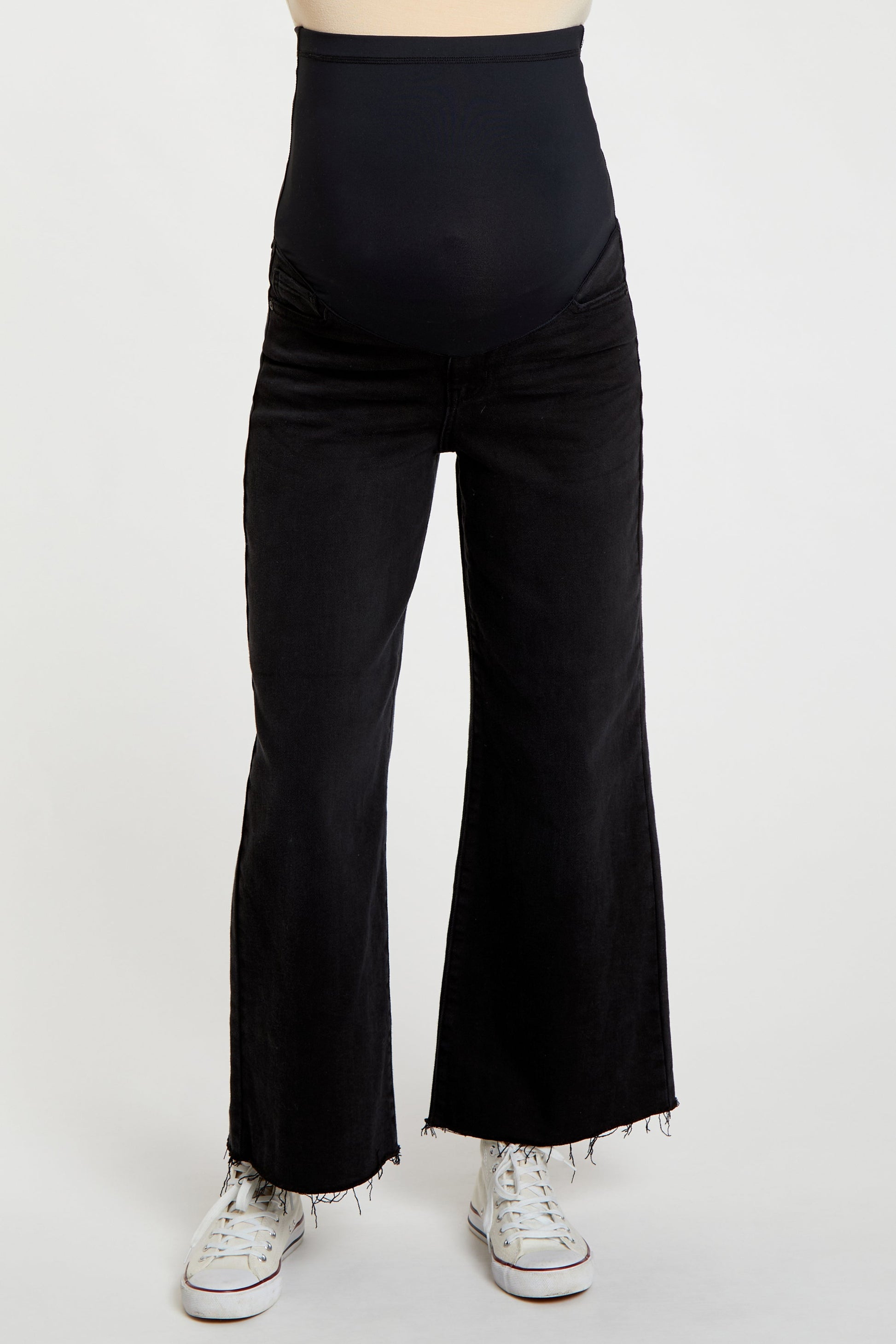 Upgrade your maternity wardrobe with these Black Wide Leg Raw Hem Maternity Jeans. Made with a soft, stretchy denim and featuring a full over-belly panel, these jeans provide comfort and support throughout pregnancy. The trendy wide leg silhouette and raw hem add a modern, fashion-forward touch to any outfit. Dress them up with a blouse and heels or keep it casual with sneakers and a tee. Designed to flatter your growing bump while offering all-day comfort, these jeans are a perfect blend of style and functionality for every mom-to-be.