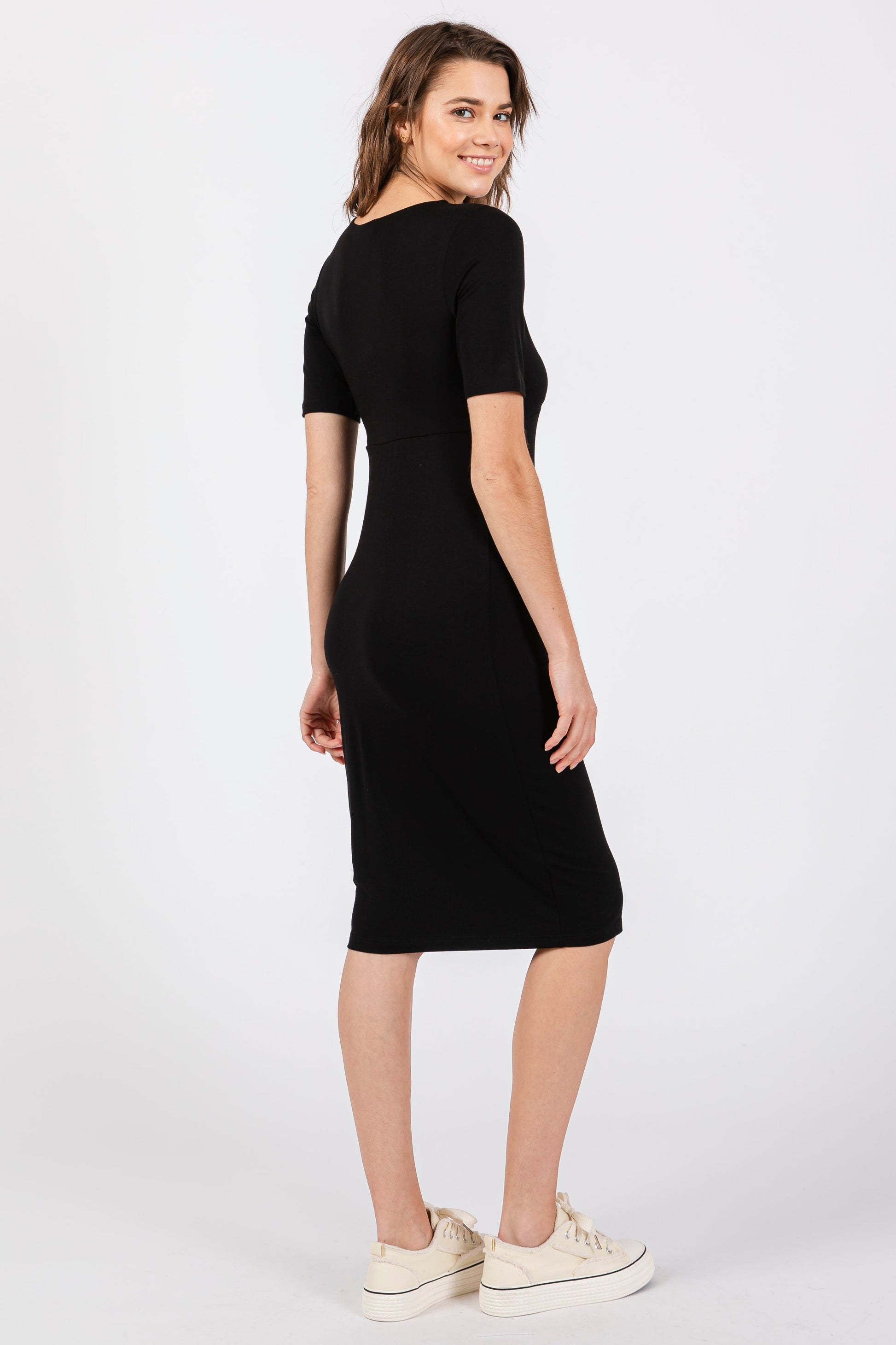 A solid knit maternity dress with a wrap v-neckline and short sleeves.
