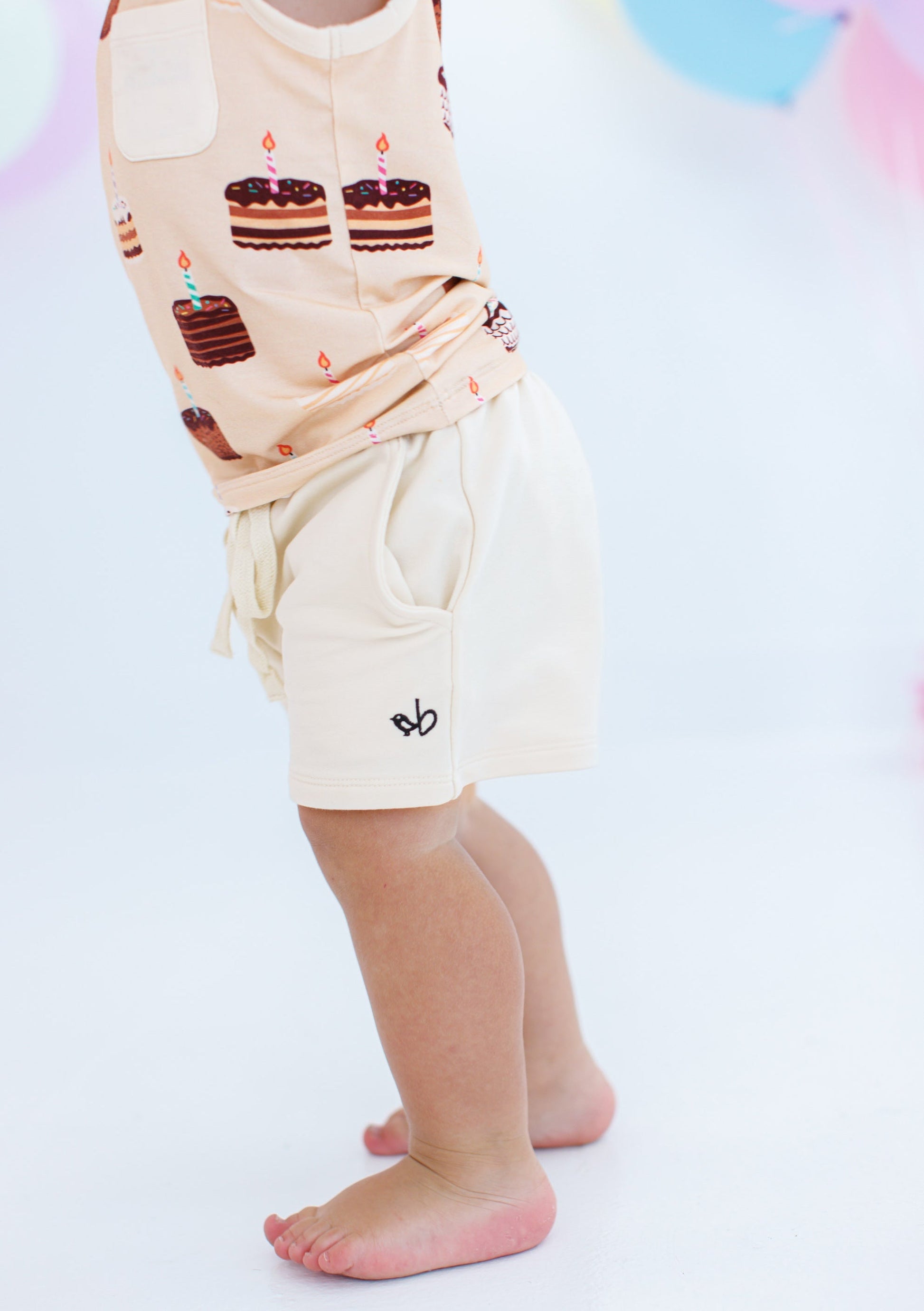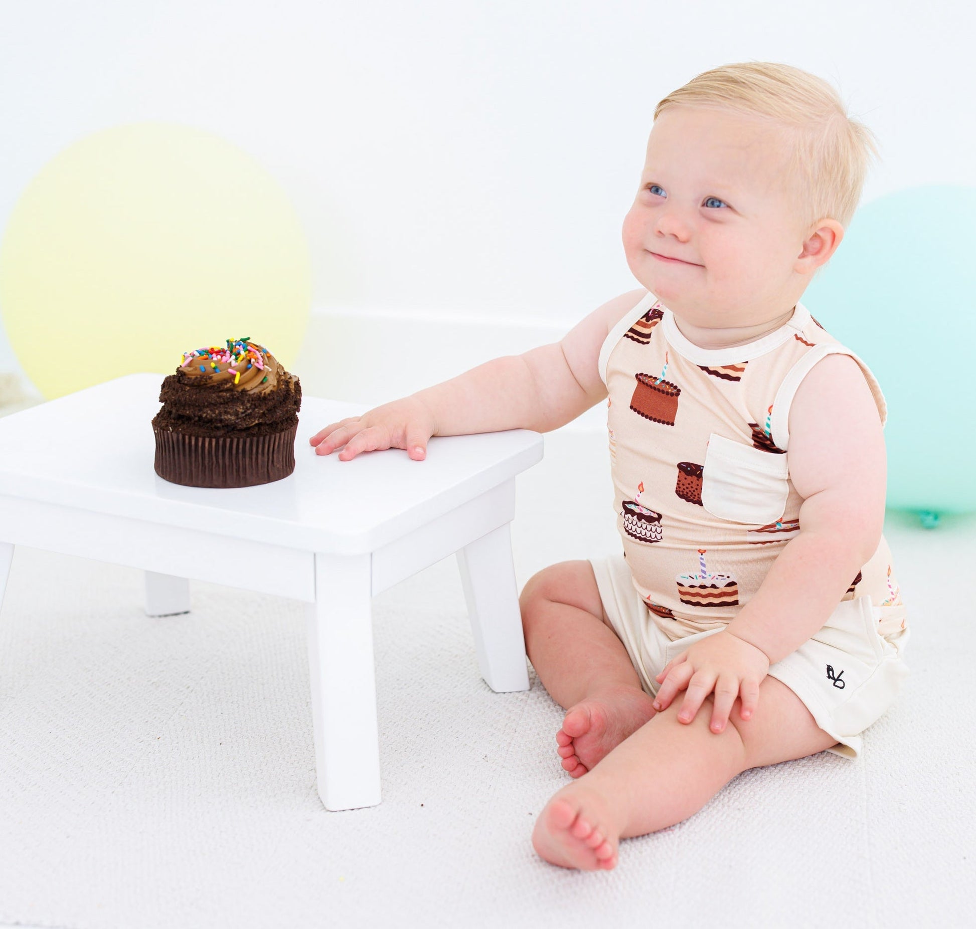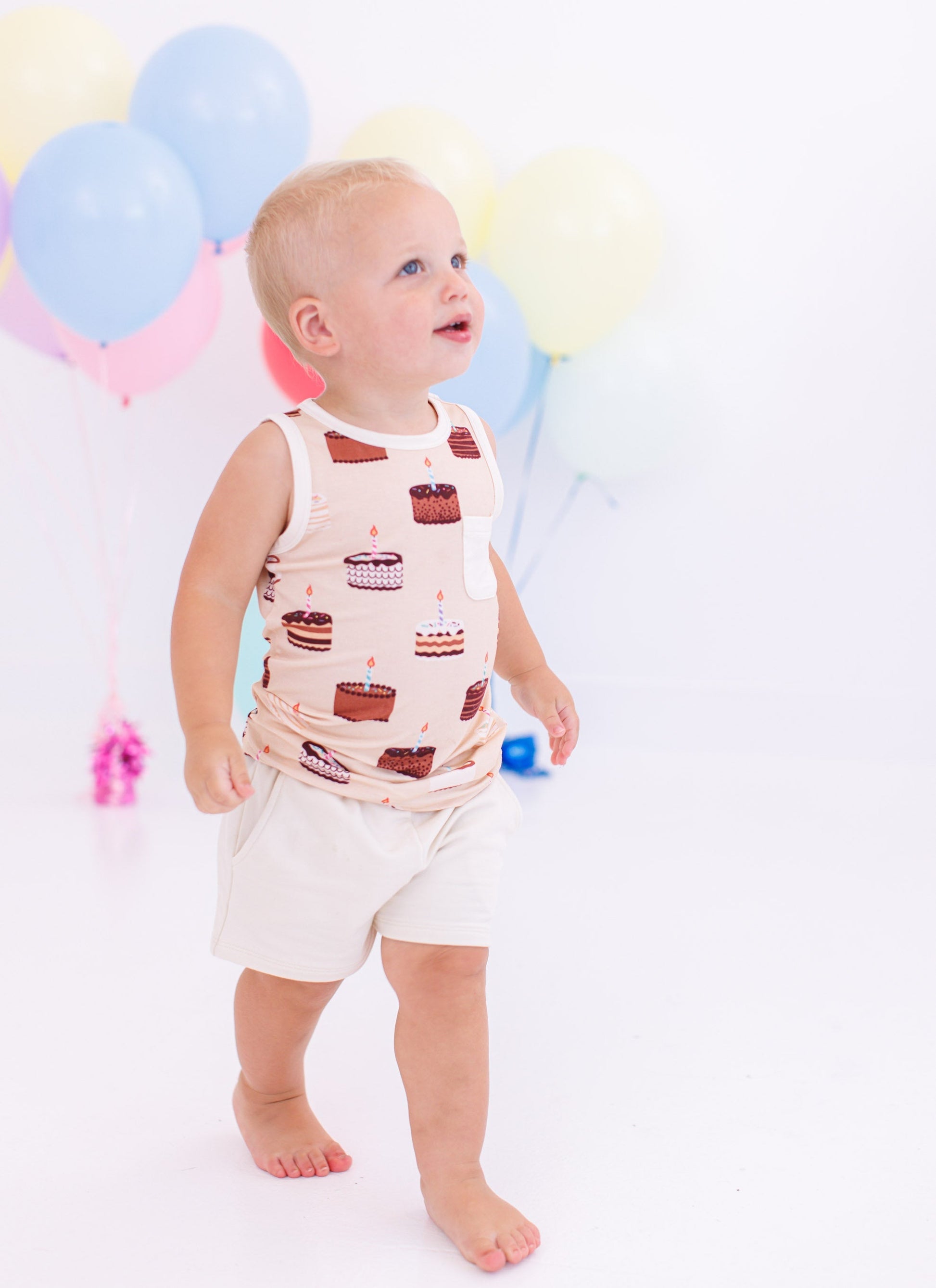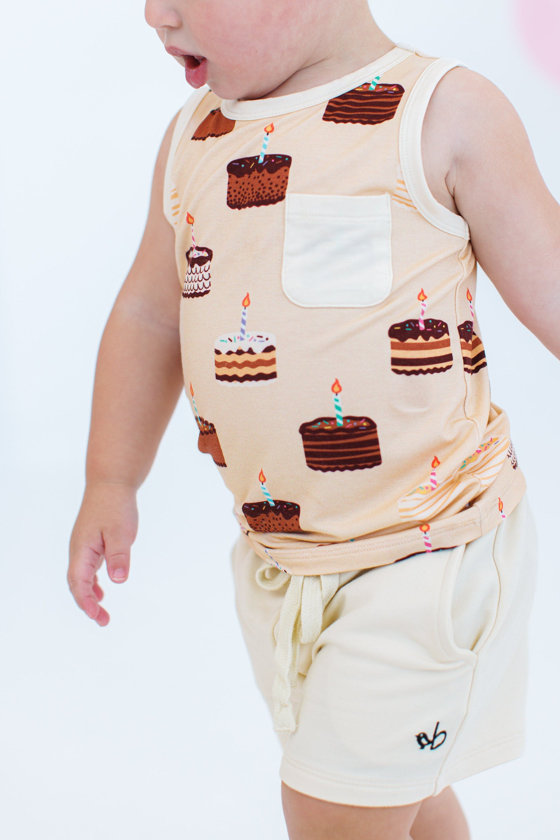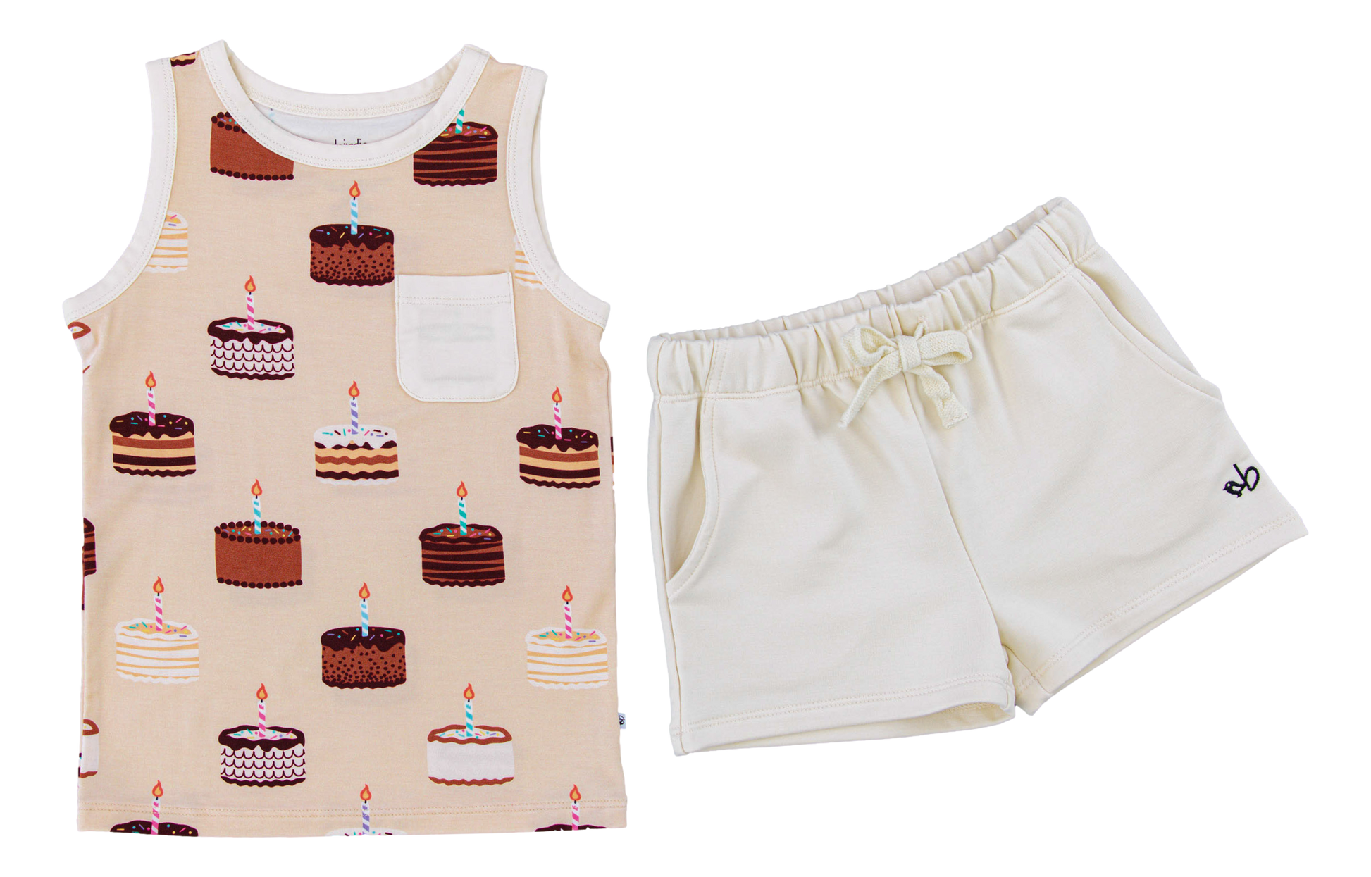 This tank top and shorts set is crafted with a tank top made with lightweight yet breathable viscose from bamboo and spandex and an ultra-comfy pair of bamboo/cotton/spandex blend shorts. Ideal for creating the sweetest birthday look, either as a set or paired with other pieces.