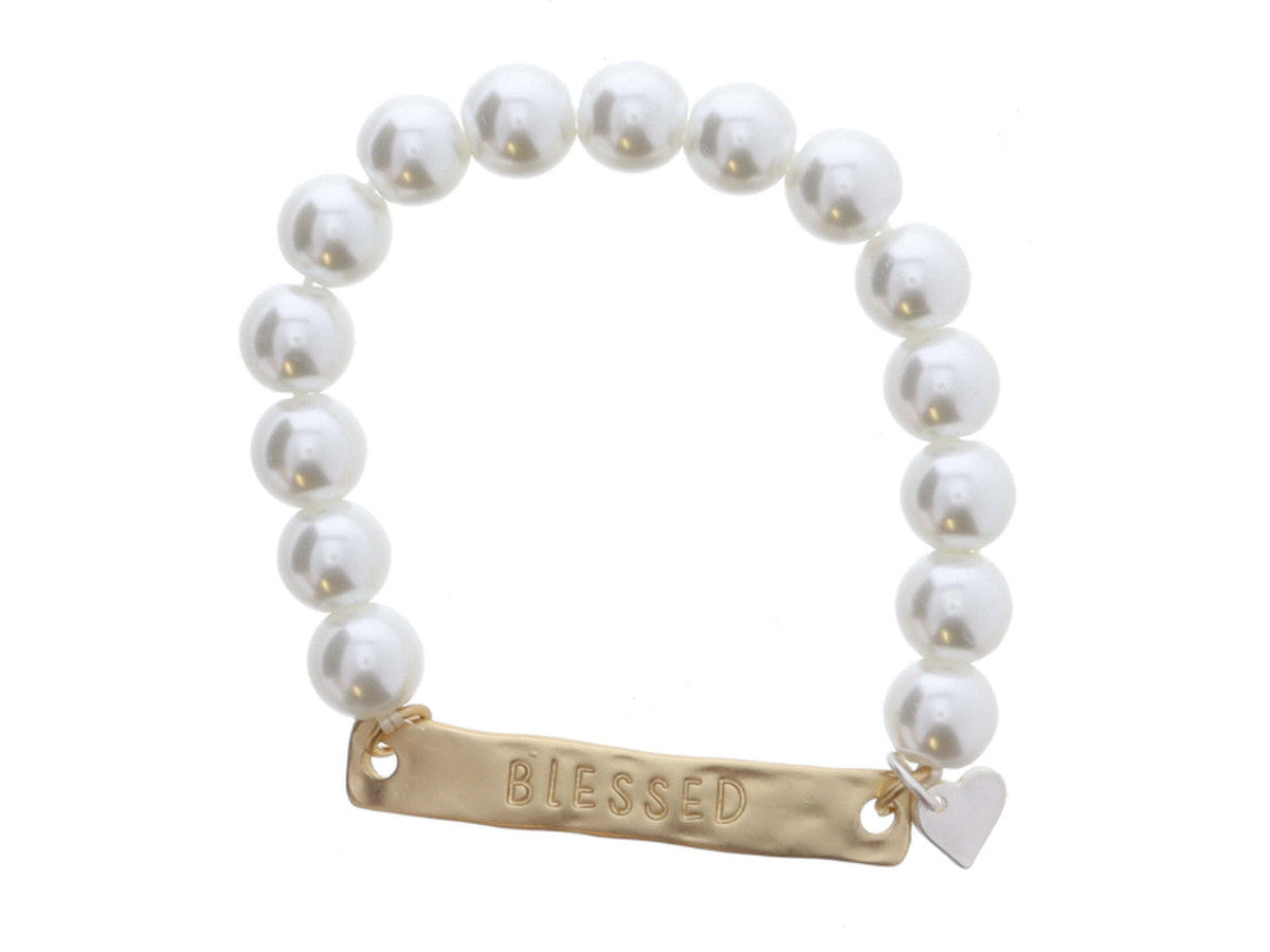 KIDS PEARL BEADED WITH GOLD "BLESSED" BAR AND MINI SILVER HEART CHARM BRACELET, .25", .25" PENDANT