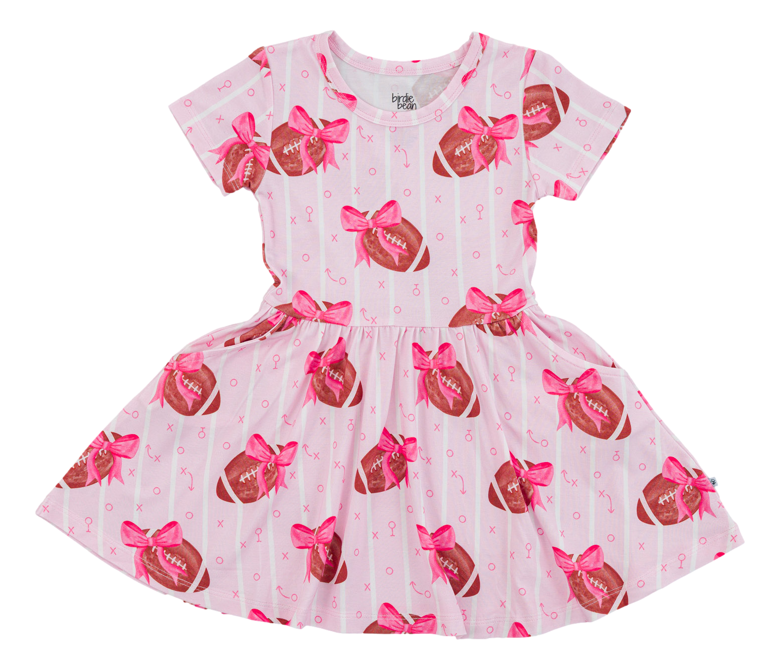 This football-themed twirl dress is made for your little MVPs who love a touch of sparkle with their sports! Featuring an all-over print of pink-bowed footballs and playful playbook icons, it's the perfect mix of sporty and sweet. The bow detail on the back adds extra charm, while the layered ruffle hem brings major twirl power. Crafted from our ultra-soft bamboo blend, it’s breathable, stretchy, and comfy enough for touchdowns, tailgates, and twirls.