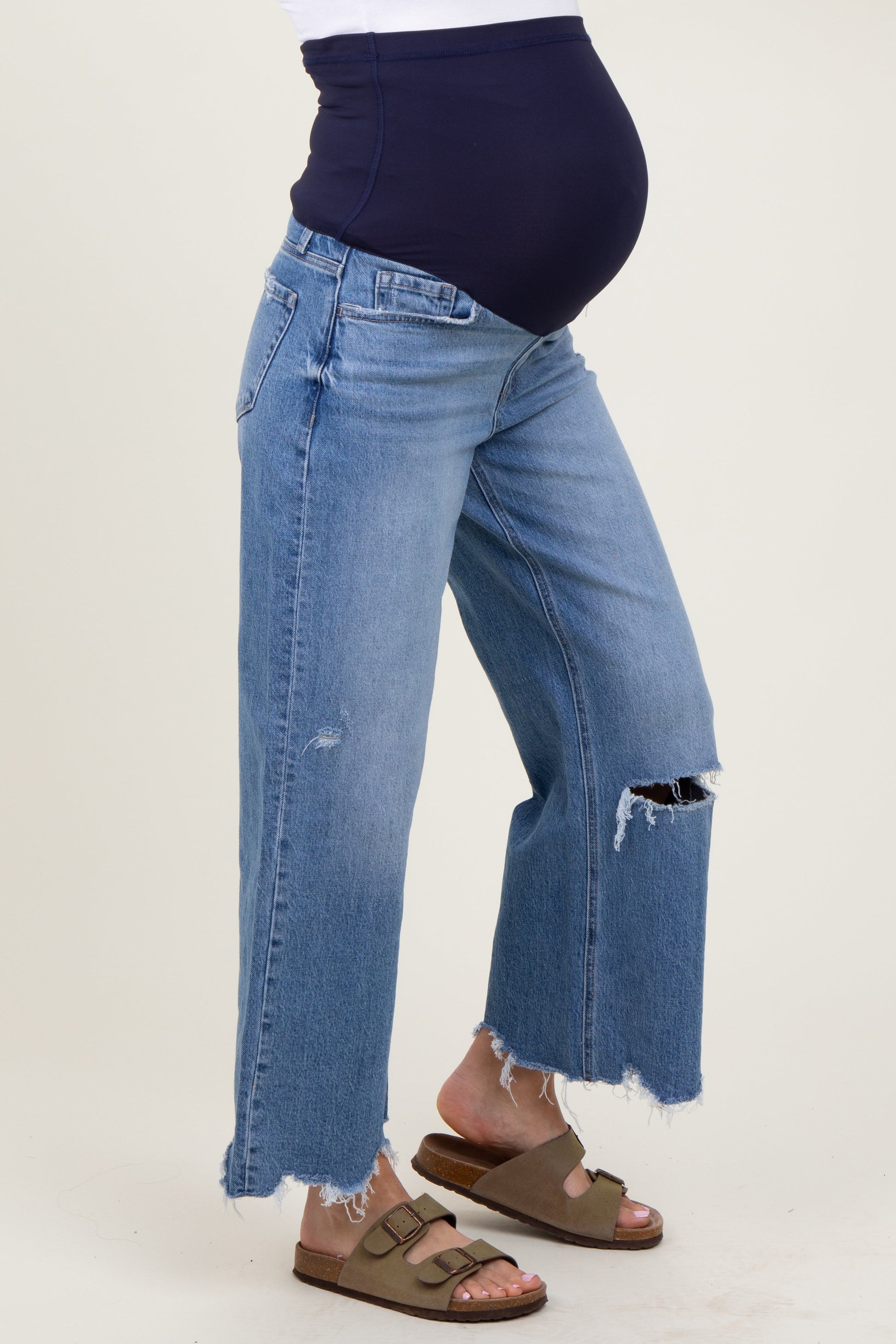Blue Distressed Fringe Open Knee Cropped Wide Leg Maternity Jeans