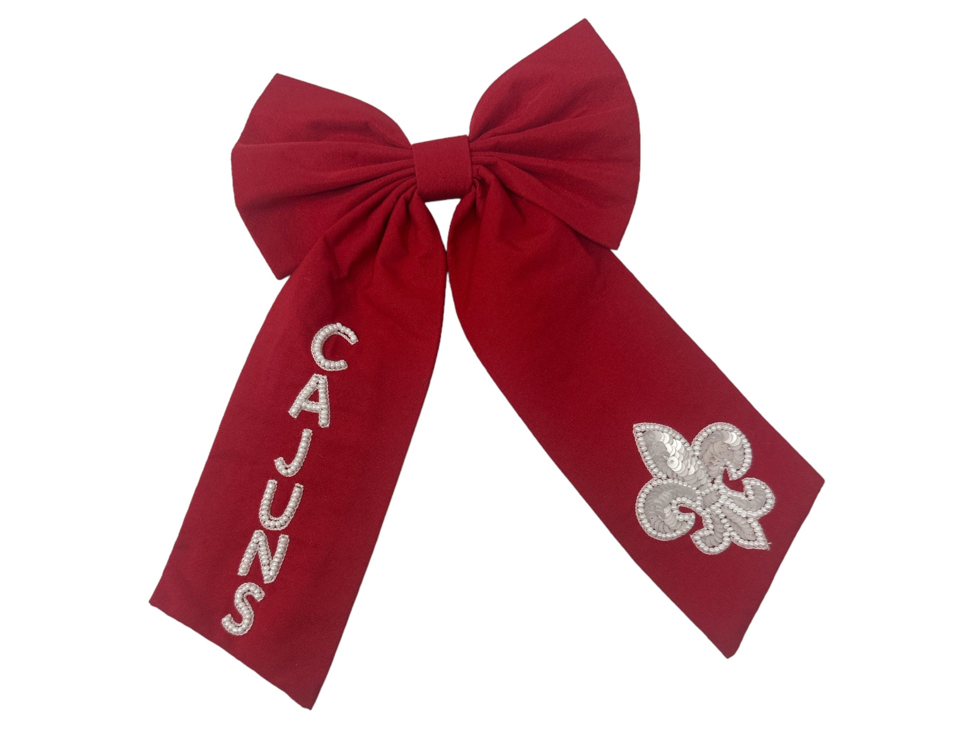 The cutest bow to cheer on the Ragin' Cajuns. Embellished with sequin and seed bead detail, this bow is a cute accessory to add to your Game Day look.