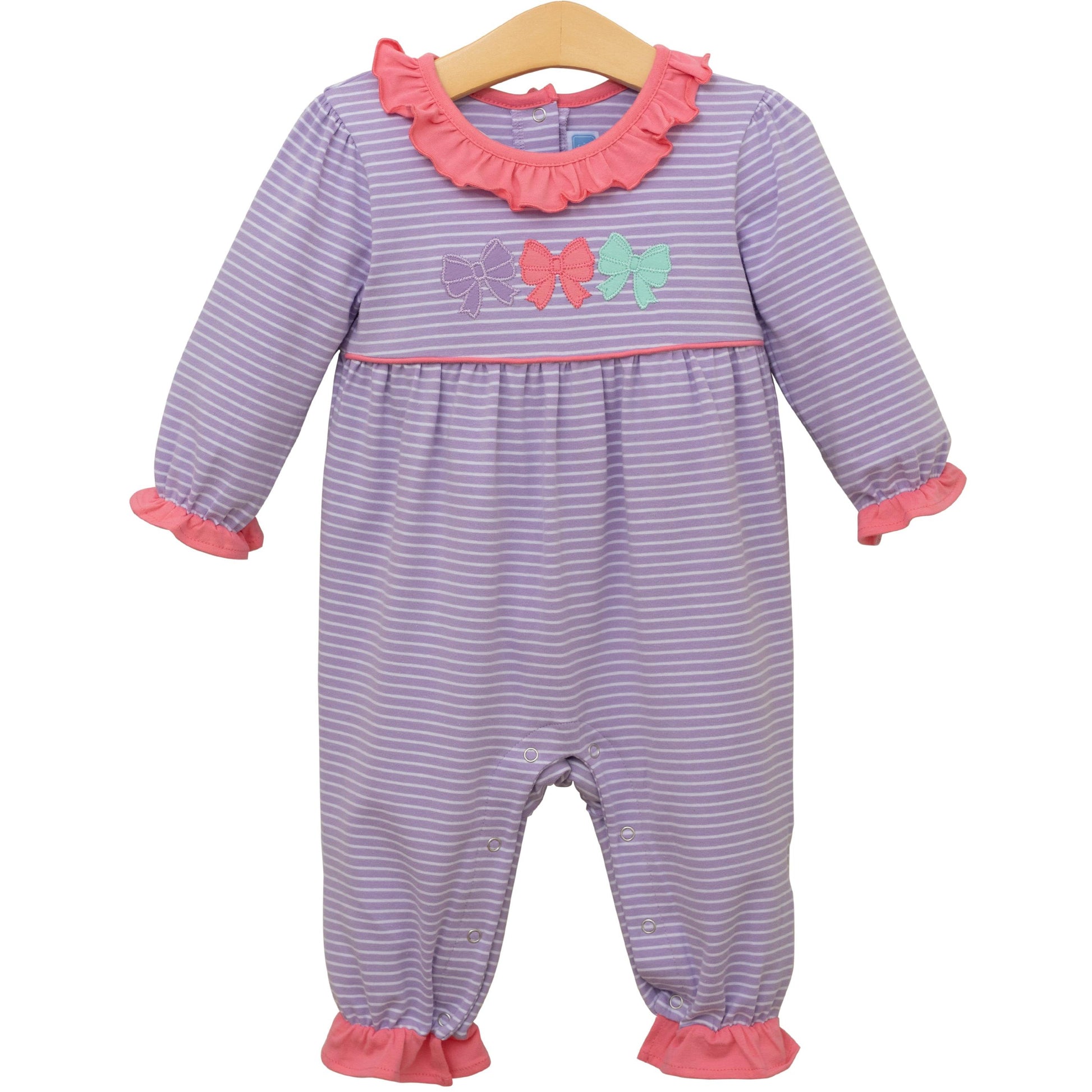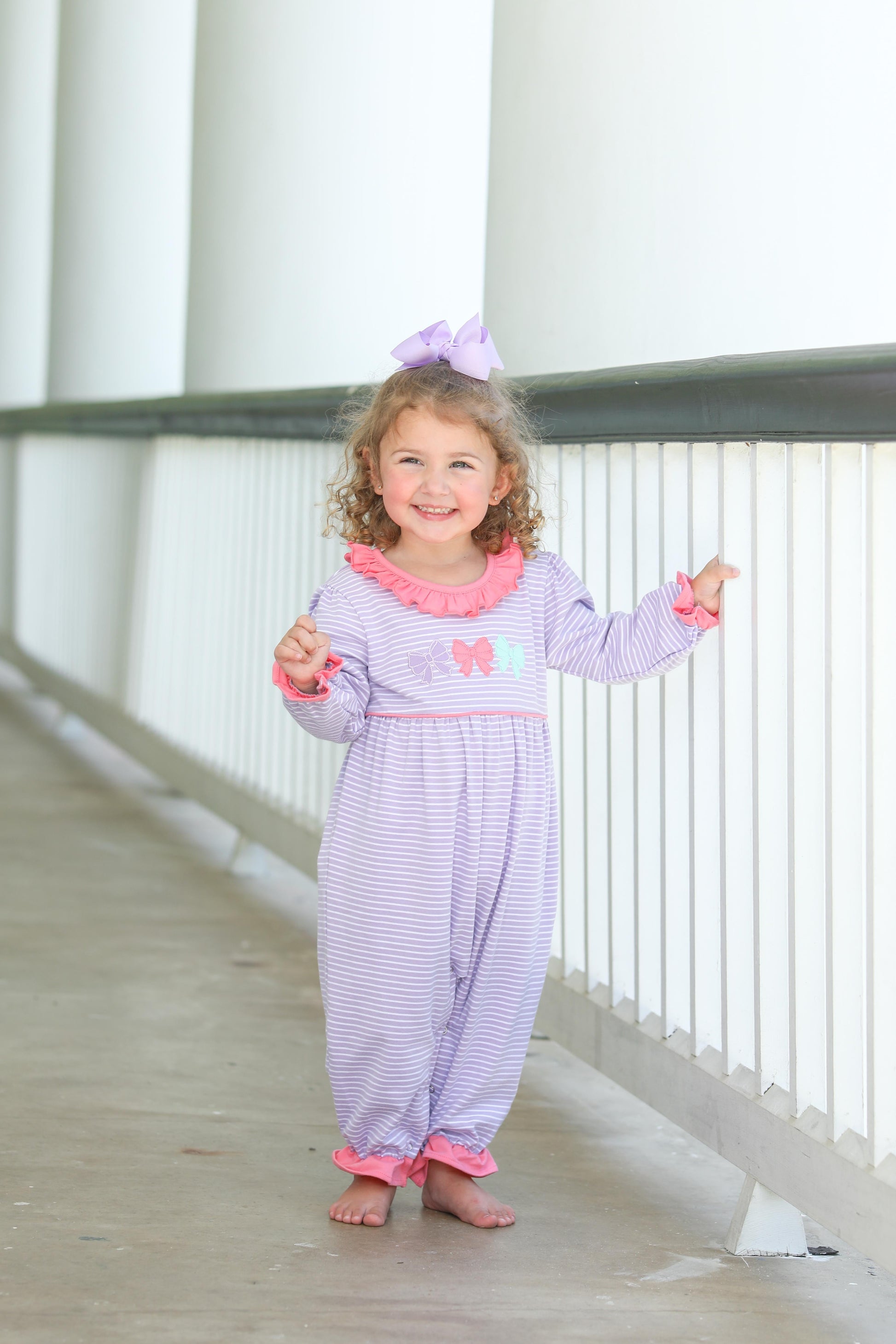 Adorable and oh-so-comfy, our Lavender Bows Baby Girl Romper from The Prissy Pelican Boutique in Bossier City, Louisiana, is the perfect blend of sweetness and style. This lavender and white striped romper features three colorful embroidered bows in purple, pink, and mint across the chest. Soft pink ruffle trim at the neckline, cuffs, and ankles adds an extra touch of charm.