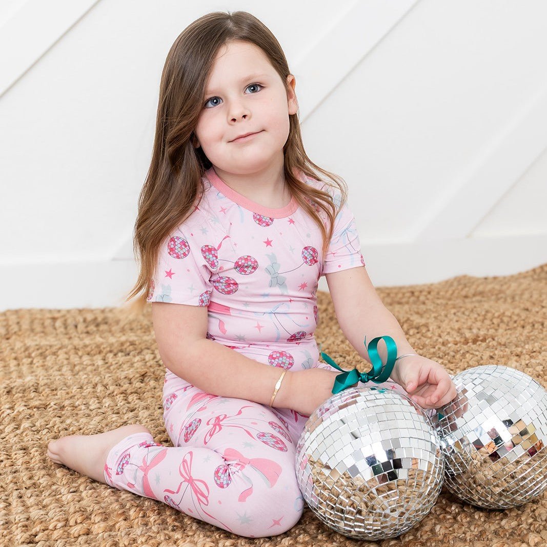 Get your little ones ready for a good nights sleep with our short sleeve Pajamas! Made from soft bamboo, these pajamas will keep them comfortable all night long. Featuring print of fun disco balls and bows, these Pajamas are the perfect combination of style and comfort for your little one to boogie the night away in dreamland.