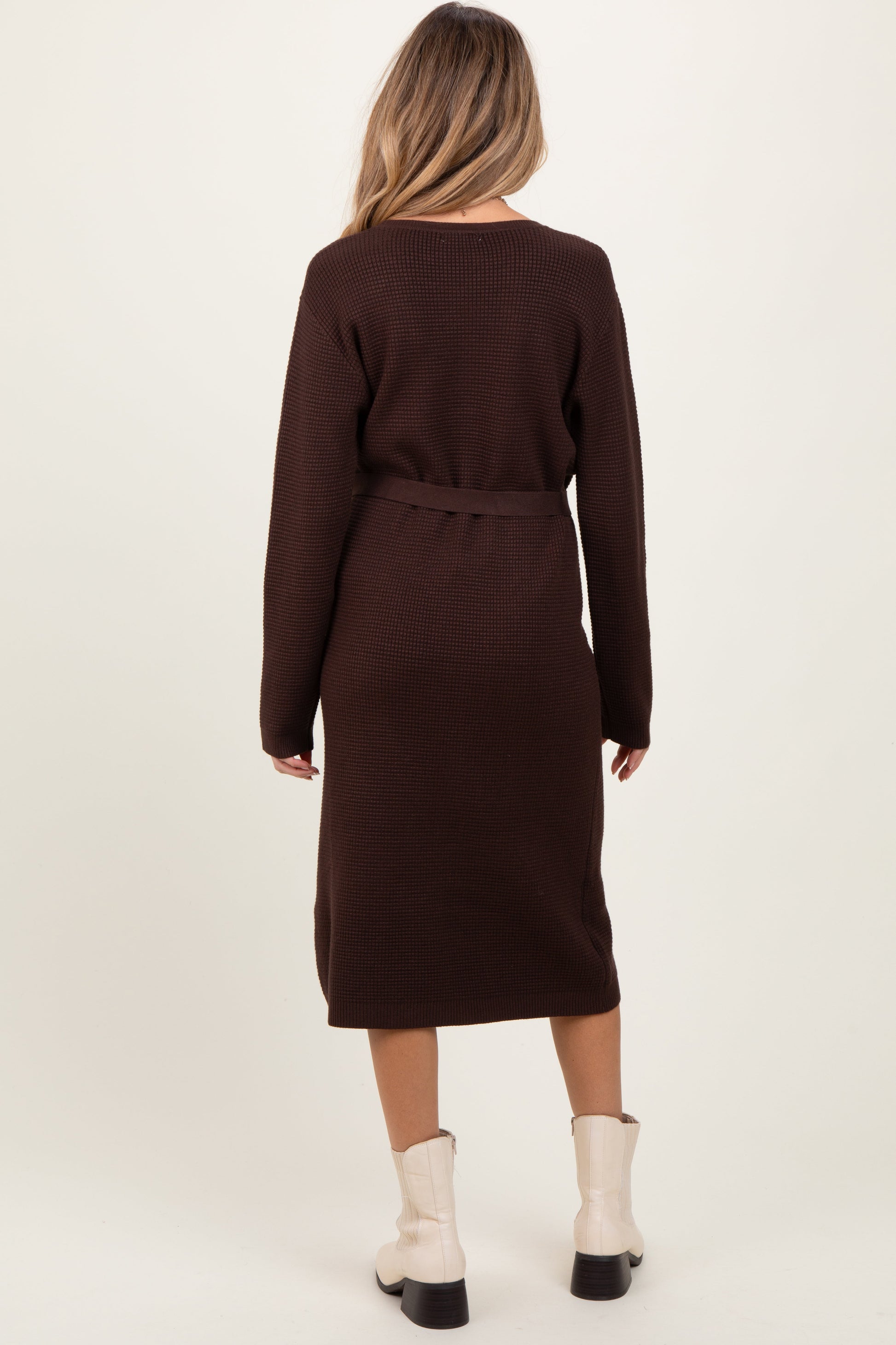 Brown Waffle Knit Sash Tie Maternity Midi Sweater Dress