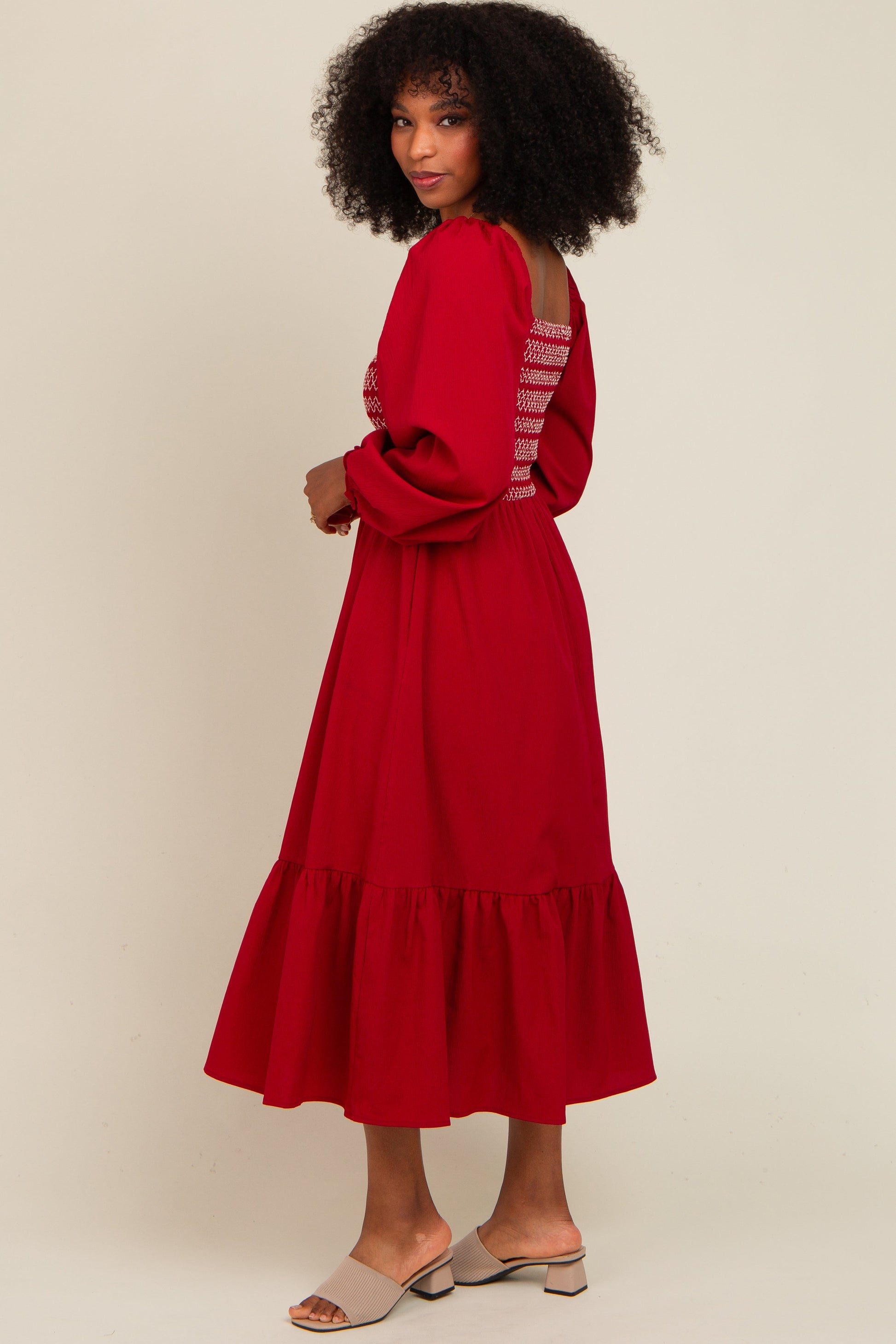 Burgundy Contrast Smocked Balloon Sleeve Midi Dress