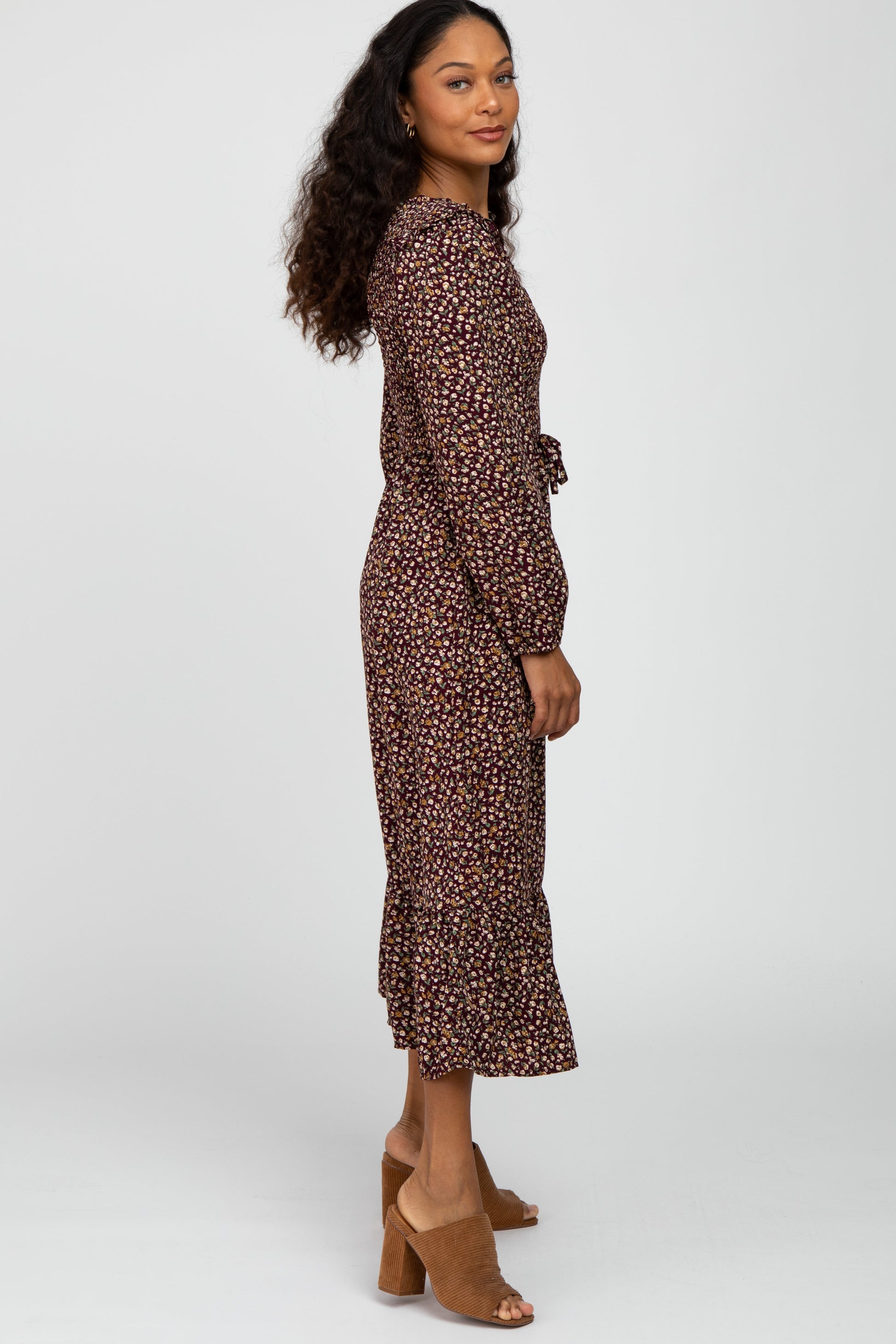 Burgundy Floral Long Sleeve Smocked Midi Dress
